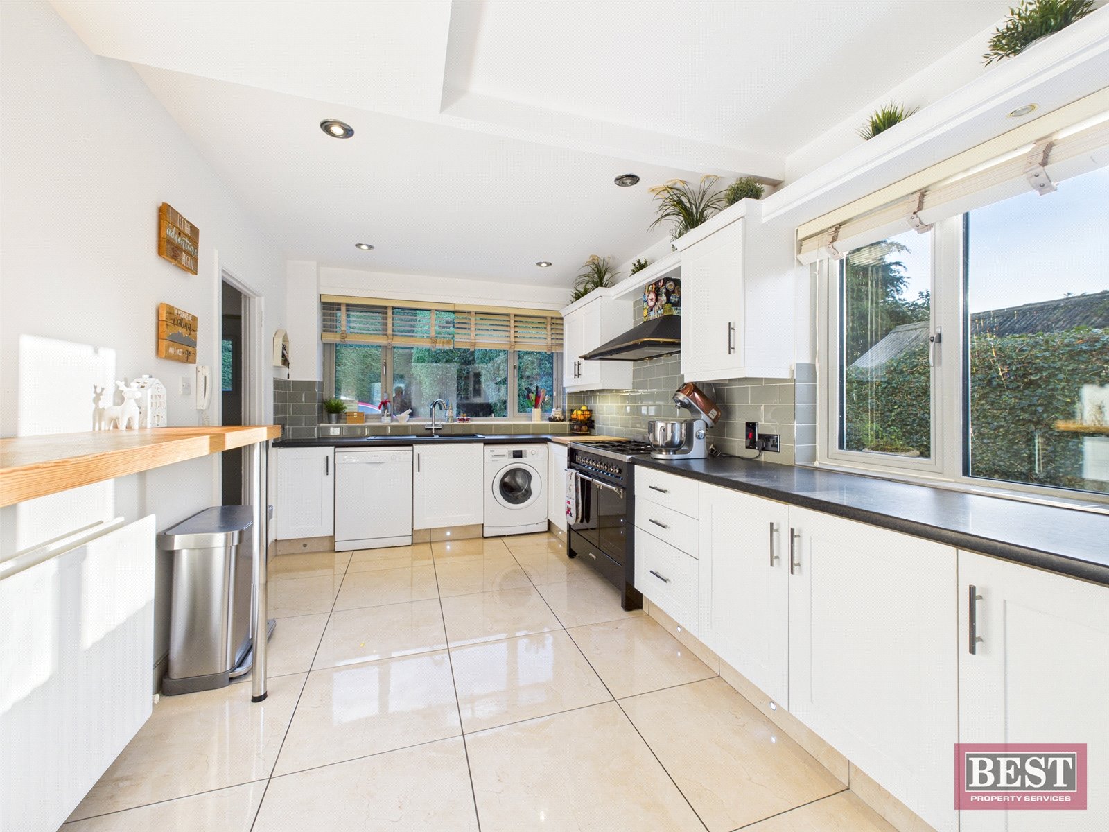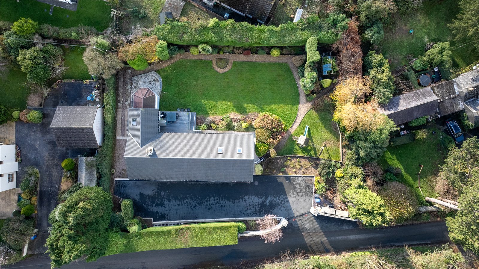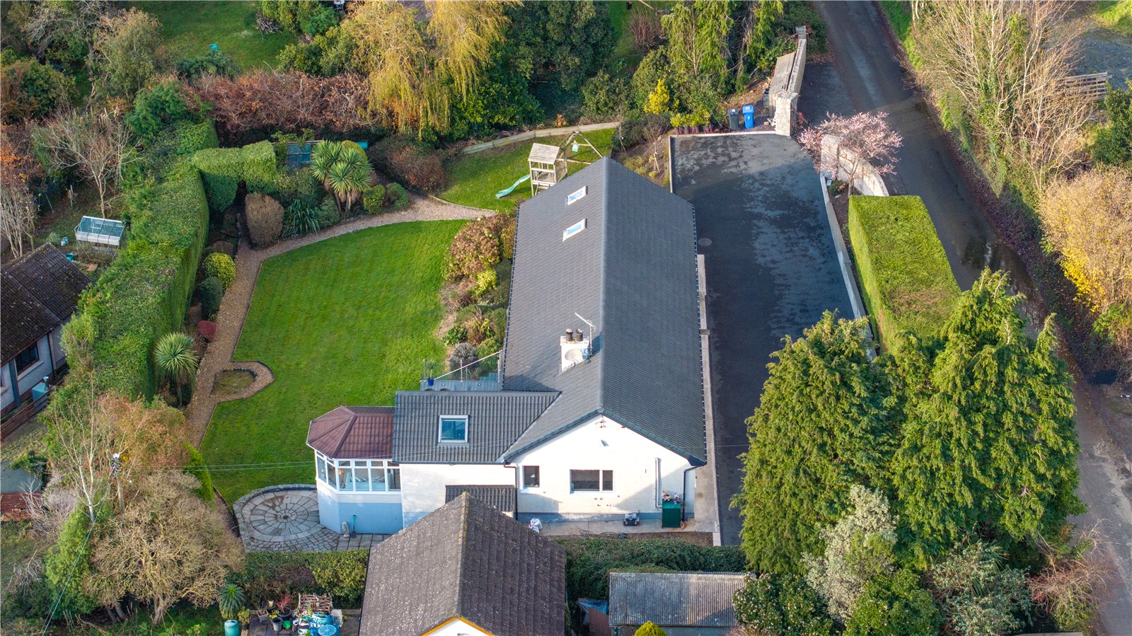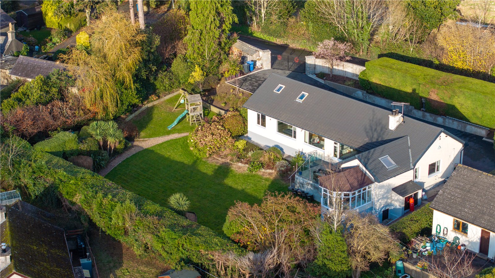 Externally, the property features electric entrance gates mounted to granite stone pillars, a large recently tarmacked driveway and mature hedging for privacy. To the rear, a composite deck with glazed surround and recessed lighting offers easy access to the kitchen and dining space and leads to a large landscaped garden and useful under-house storage.
