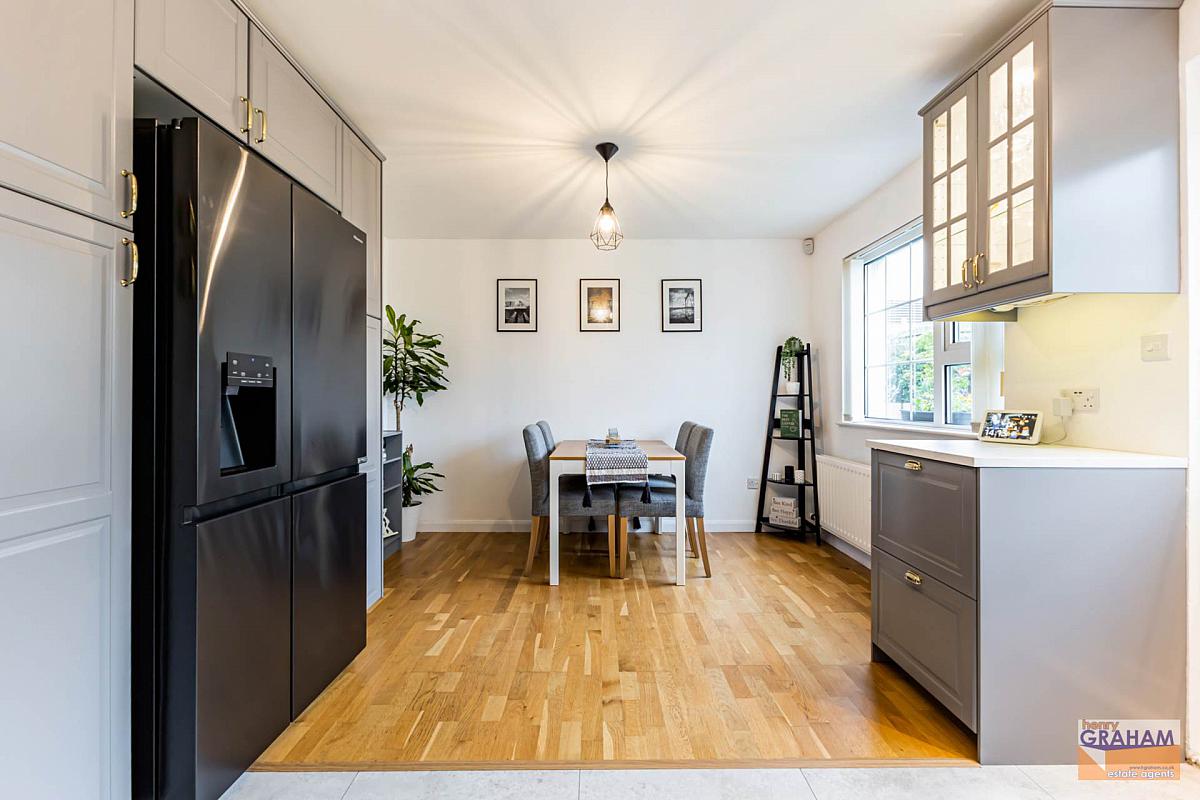 Measurement taken to widest points. Range of high and low level units. Marble effect worktops. Single drainer stainless steel sink unit. Swan neck mixer tap. Integrated oven and ceramic hob. Extractor hood in stainless steel and glass canopy. Plumbed for dishwasher. Glazed cabinet with lighting. Oak floor in dining area.