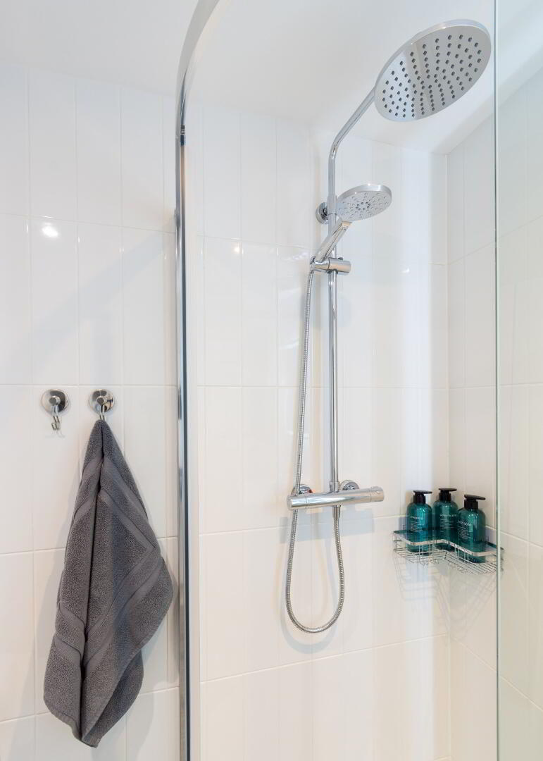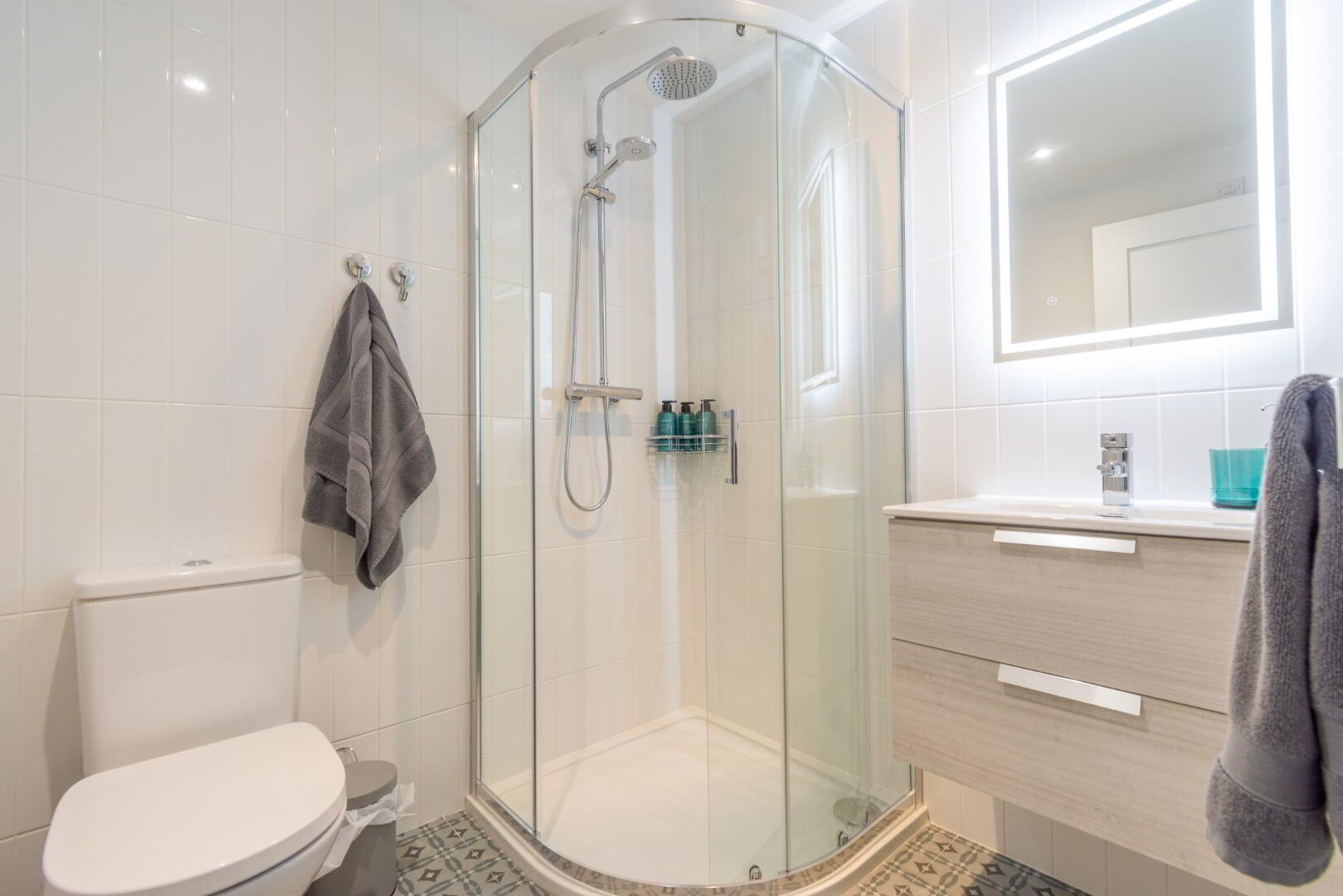 1.93m x 1.76m (6' 4" x 5' 9") White suite comprising, low flush W.C, wall mounted wash hand basin with incorporated vanity unit, shower cubicle with thermostatically controlled shower unit, recess lighting, tiled walls, tiled floor.