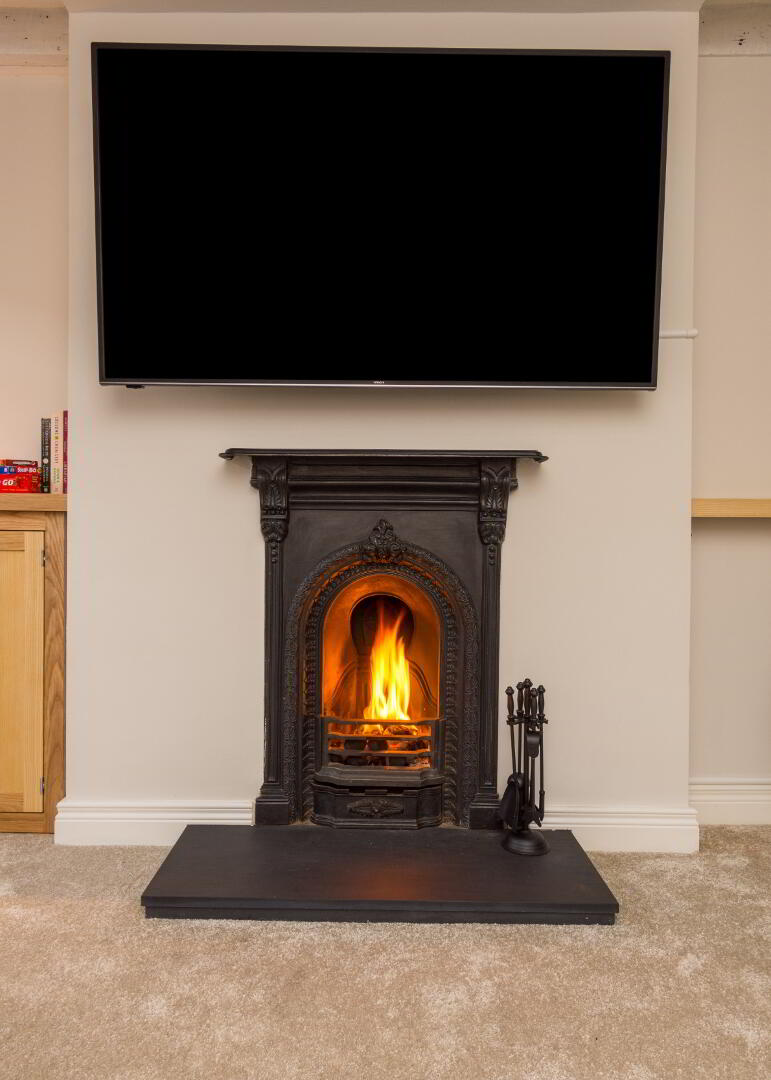 3.95m x 3.03m (13' 0" x 9' 11") Carpet, double panel radiator, fireplace with black granite hearth, solid ash wood cabinet and shelf, storage under stairs.