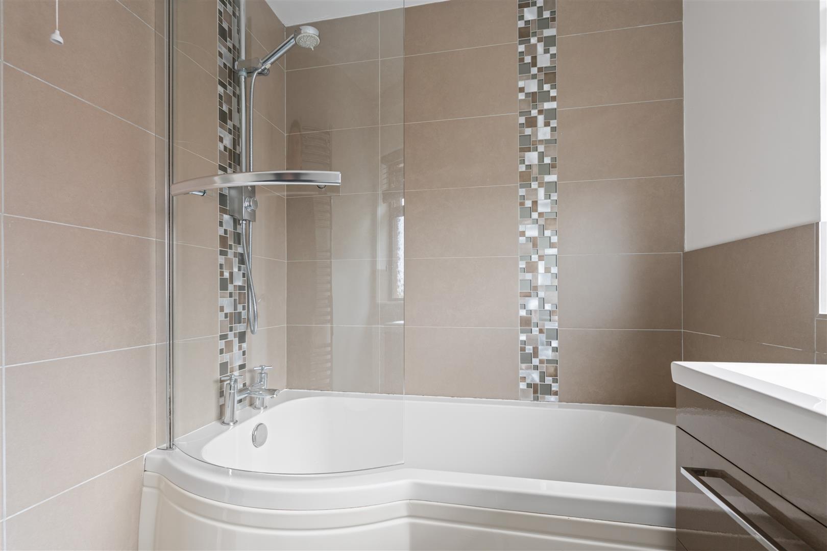 Stunning white suite comprising curved panel bath with pillar mixer tap; Aqualisa thermostatically controlled shower unit and wall mounted telephone shower attachment; curved glass shower screen; wall mounted wash hand basin with mixer tap; close coupled wc; part tiled walls; tiled floor; towel radiator; extractor fan.