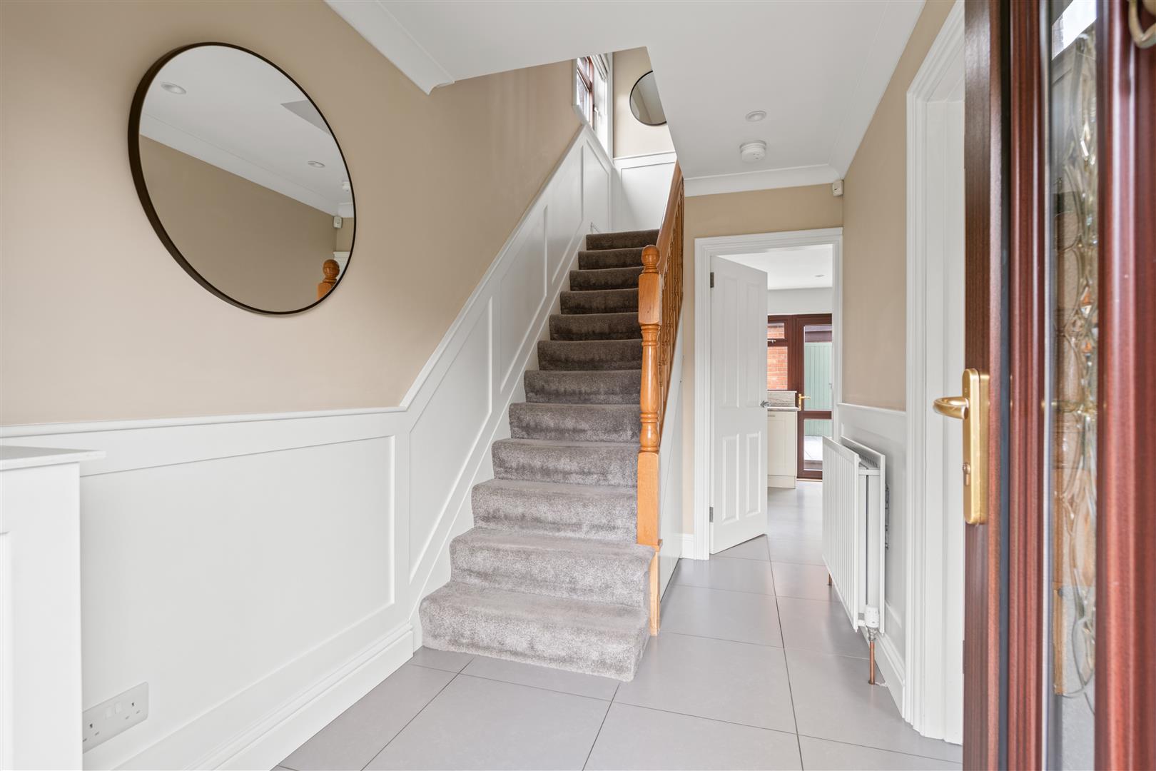 Glazed Pvc entrance door with matching side light; feature wall panelling; tiled floor; understairs storage cupboard; recessed spotlights; corniced ceiling.