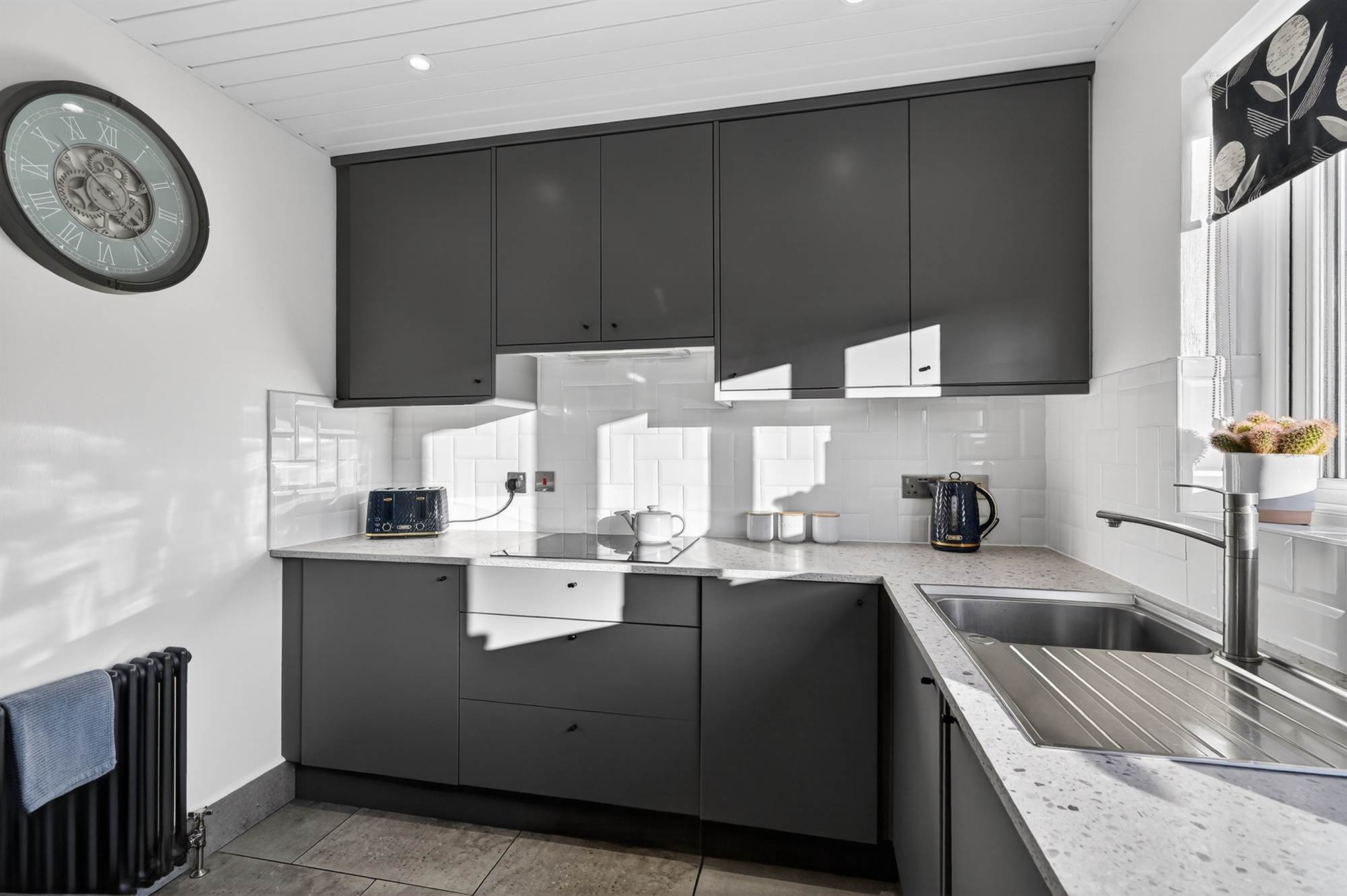 Range of high and low level units, built in oven, hob and extractor fan, integrated fridge freezer and washing machine, stainless steel sink with mixer tap, granite worksurfaces, tiled splash back, ceramic floor tiling.
