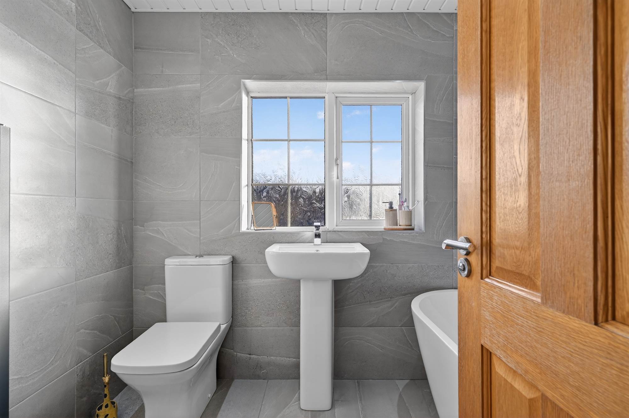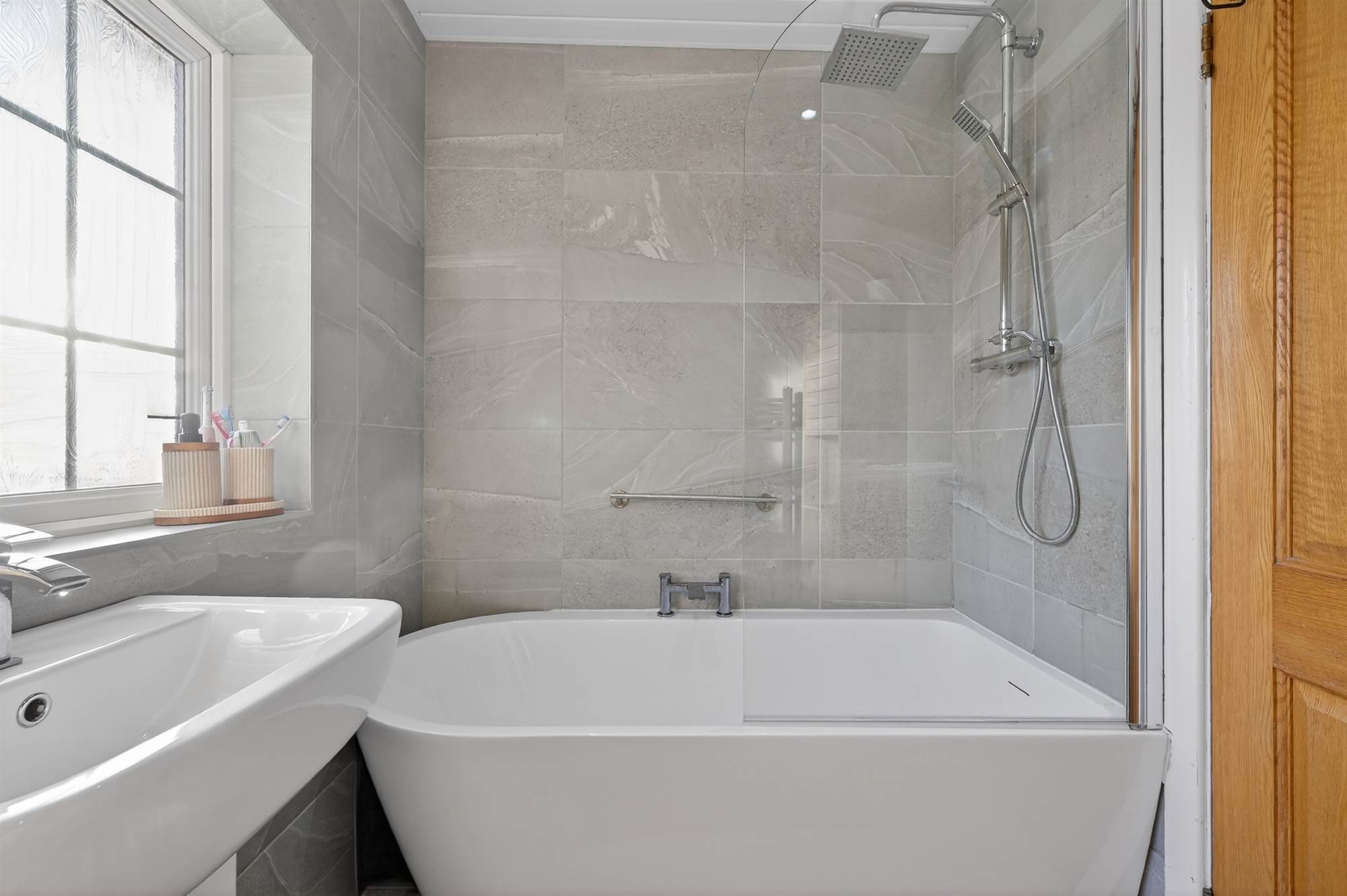Low flush WC, wash hand basin, bath with overhead shower, heated towel rail, fully tiled, recessed lighting.