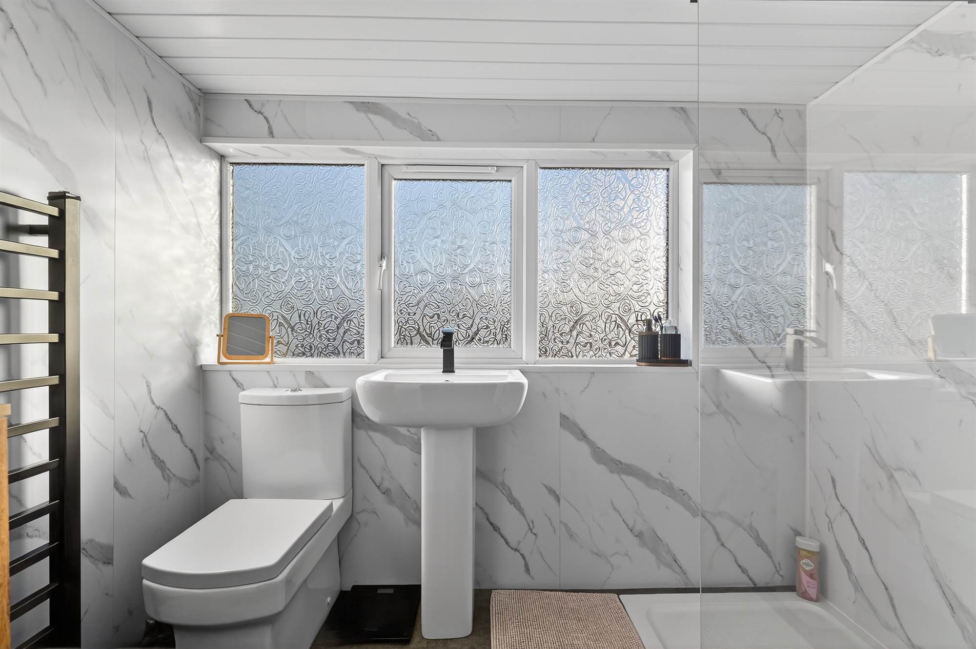 Low flush WC, wash hand basin, walk in shower, heating towel rail, uPVC floor and wall panelling, recessed lighting.