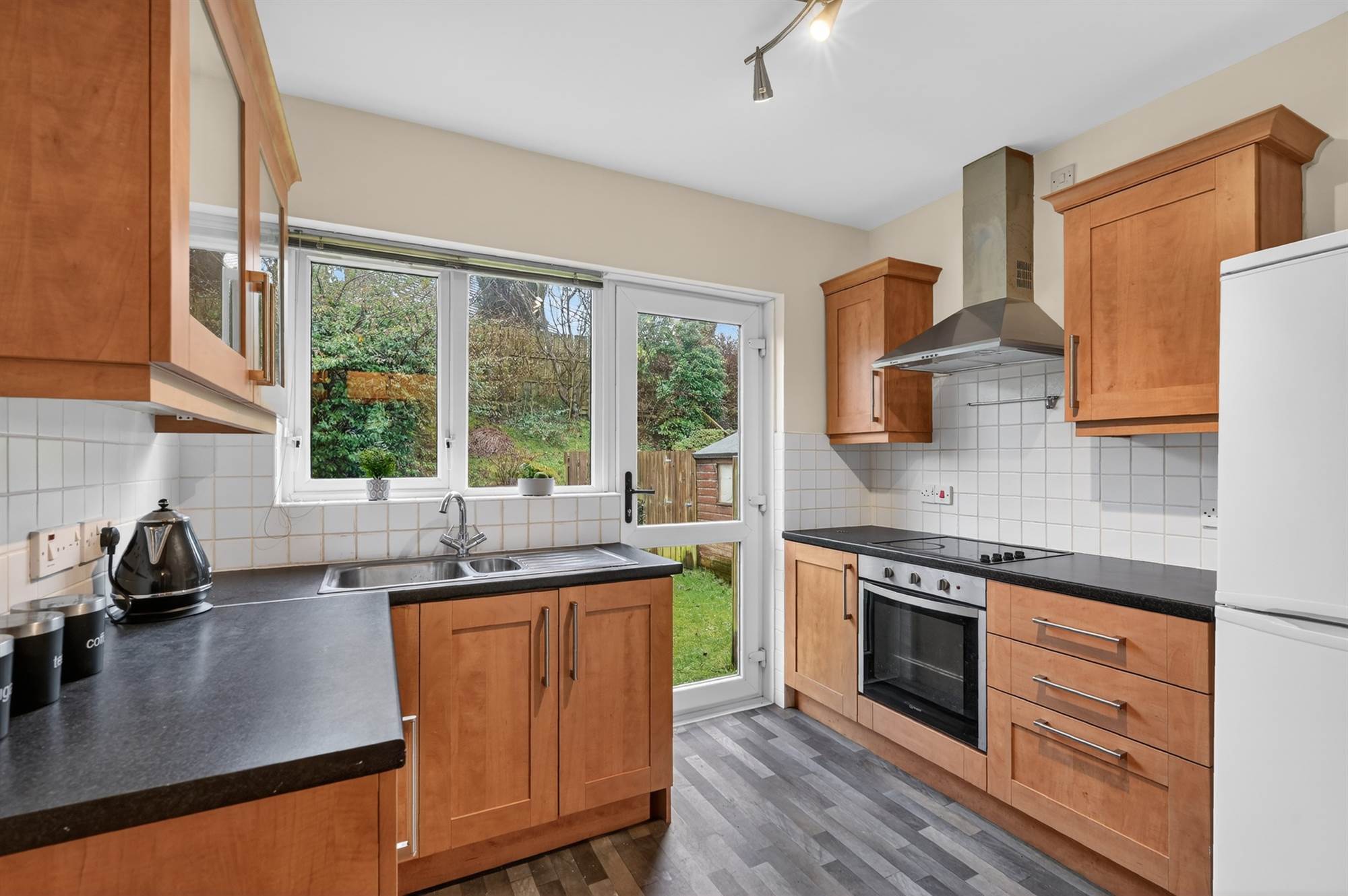 Fully fitted kitchen with range of high and low level units, laminate work surfaces, stainless steel single drainer 1.5 unit with mixer tap, part tiled walls, built in oven, integrated 4 ring ceramic hob, extractor fan above, uPVC double glazed access door to rear garden.