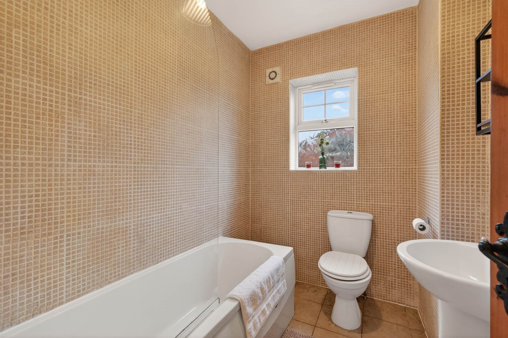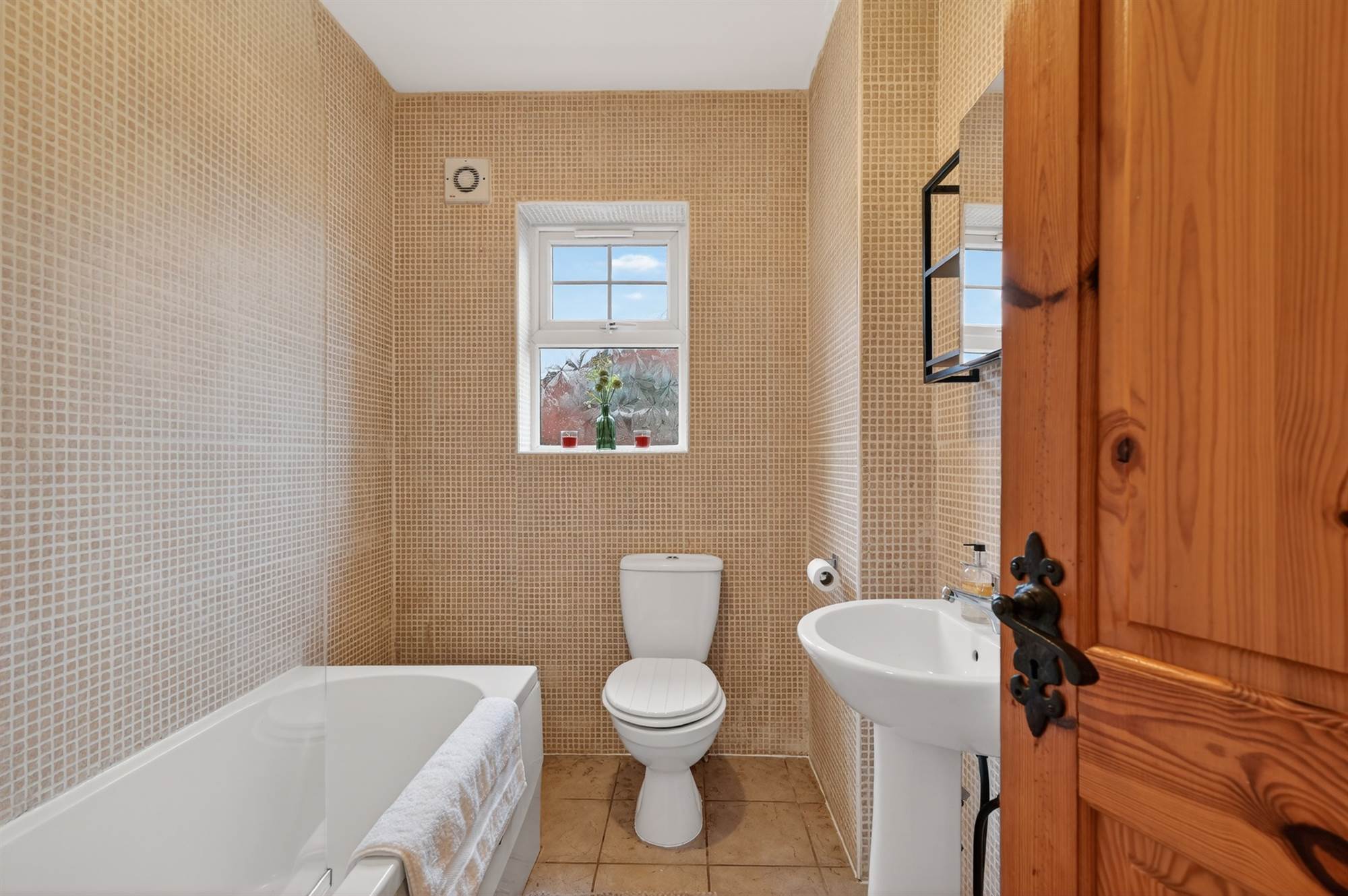 White suite comprising low flush WC, pedestal wash hand basin with chrome mixer tap, panelled bath with shower screen, built in Mira event shower unit, fully tiled walls, ceramic tiled floor, extractor fan.