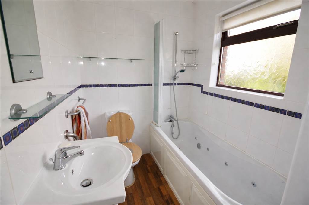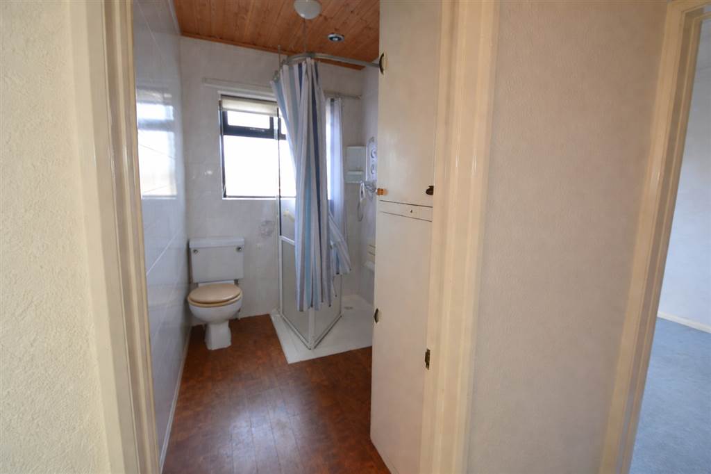 White suite comprising shower, vanity wash hand basin and low flush wc. Airing cupboard, heated towel rail and tiled walls.