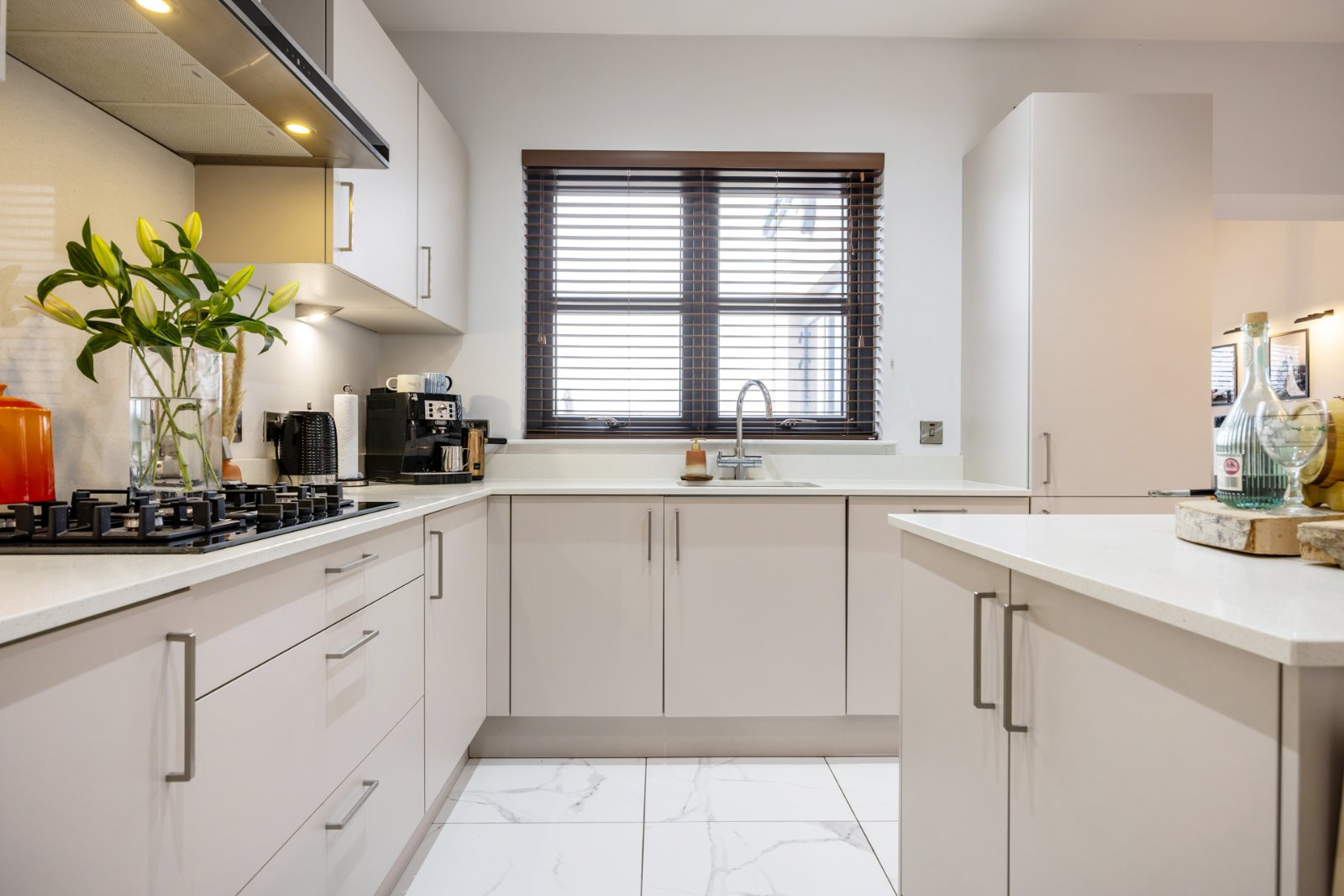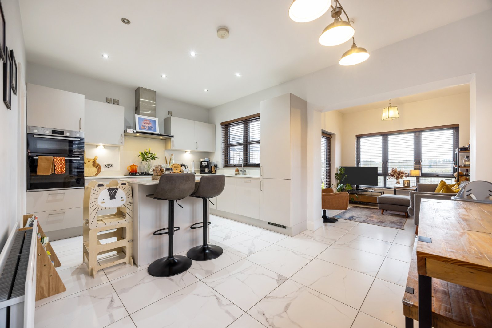 Tiled floor, spotlighting, range of high and low level units, quartz worktops, inset stainless steel sink, integrated fridge freezer, integrated dishwasher, 5 ring gas hob, stainless steel extractor fan, Bosch double electric oven, family island