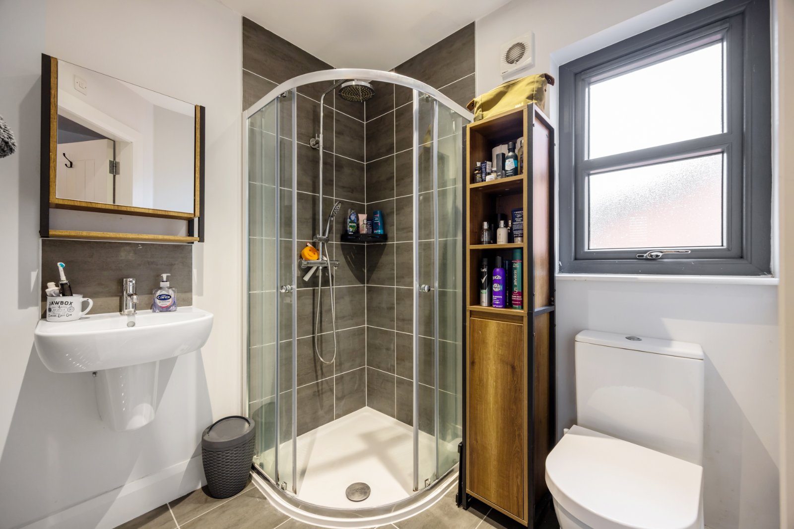 Ceramic tiled floor, low flush WC, pedestal wash hand basin, fully tiled corner shower cubicle with rainhead shower, extractor fan, spotlighting, chrome heated towel radiator