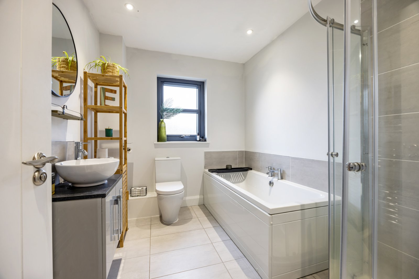 Ceramic tiled floor, low flush WC, pedestal wash hand basin with vanity unit, bath with tiled surrouund, fully tiled corner shower cubicle with rainhead shower, spotlighting, extractor fan