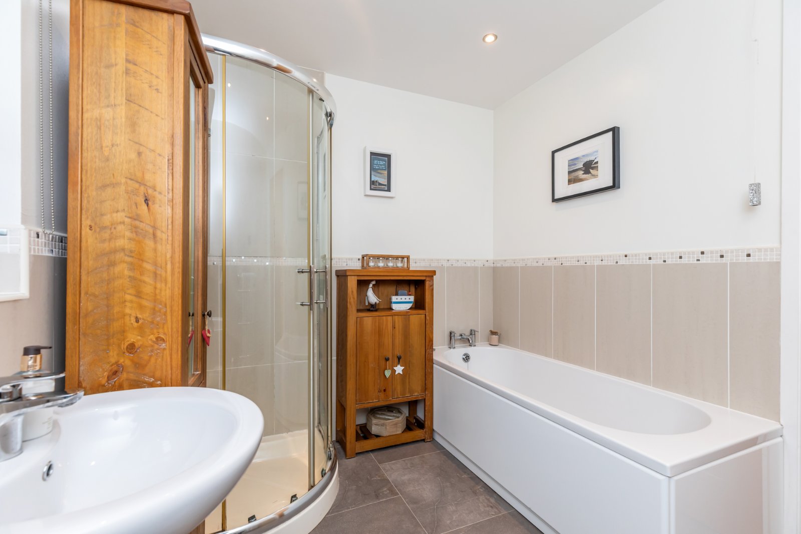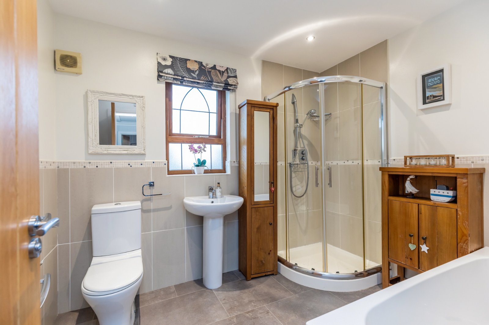 Panelled bath, mixer taps, shower enclosure, WC and wash hand basin