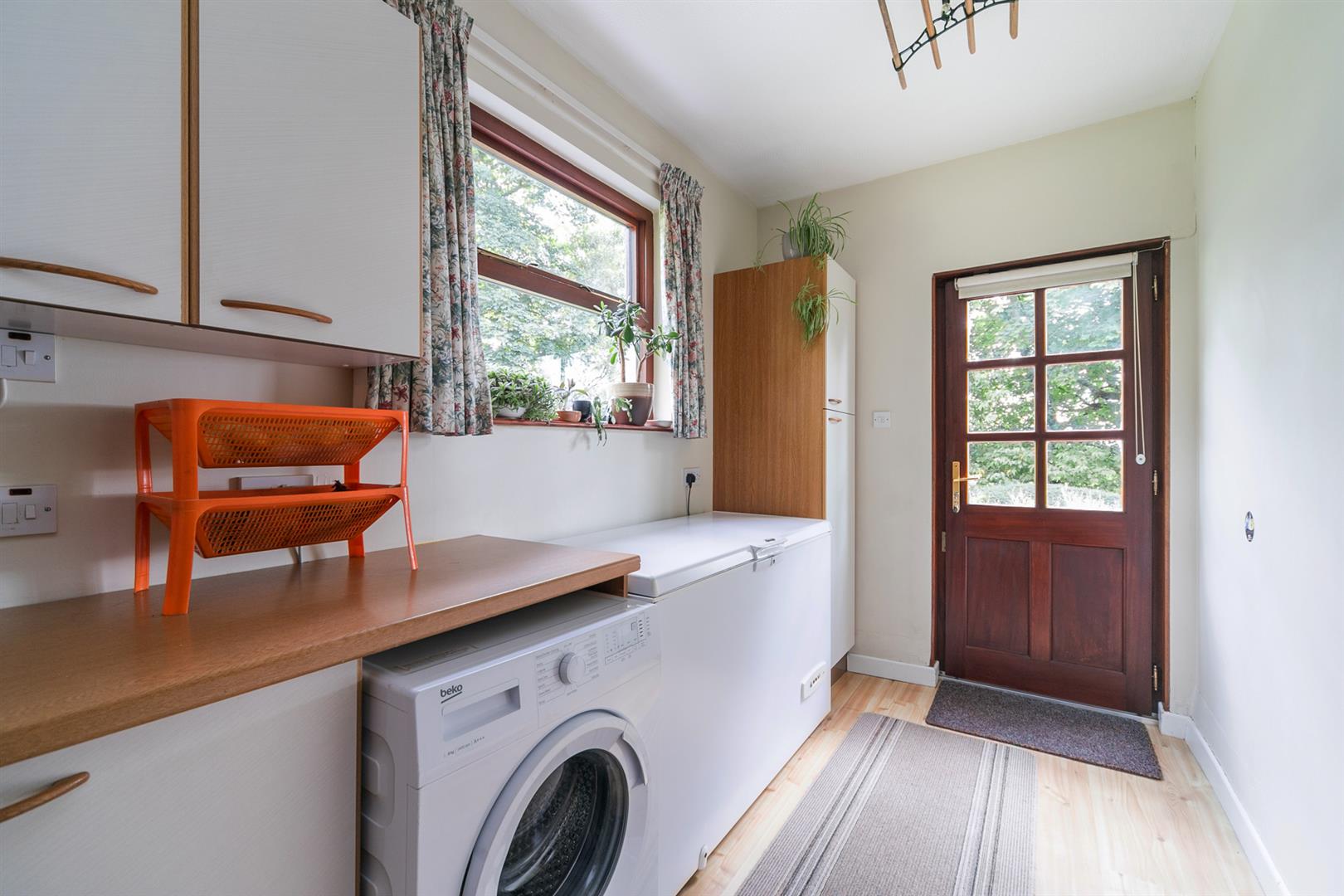 A range of high and low level units with space for washing machine, tumble dryer and freezer. Gas boiler and door to rear.