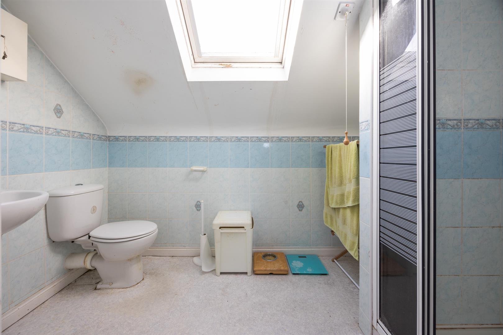 Suite comprising low flush w.c, wash hand basin and shower cubicle. Tiled walls.