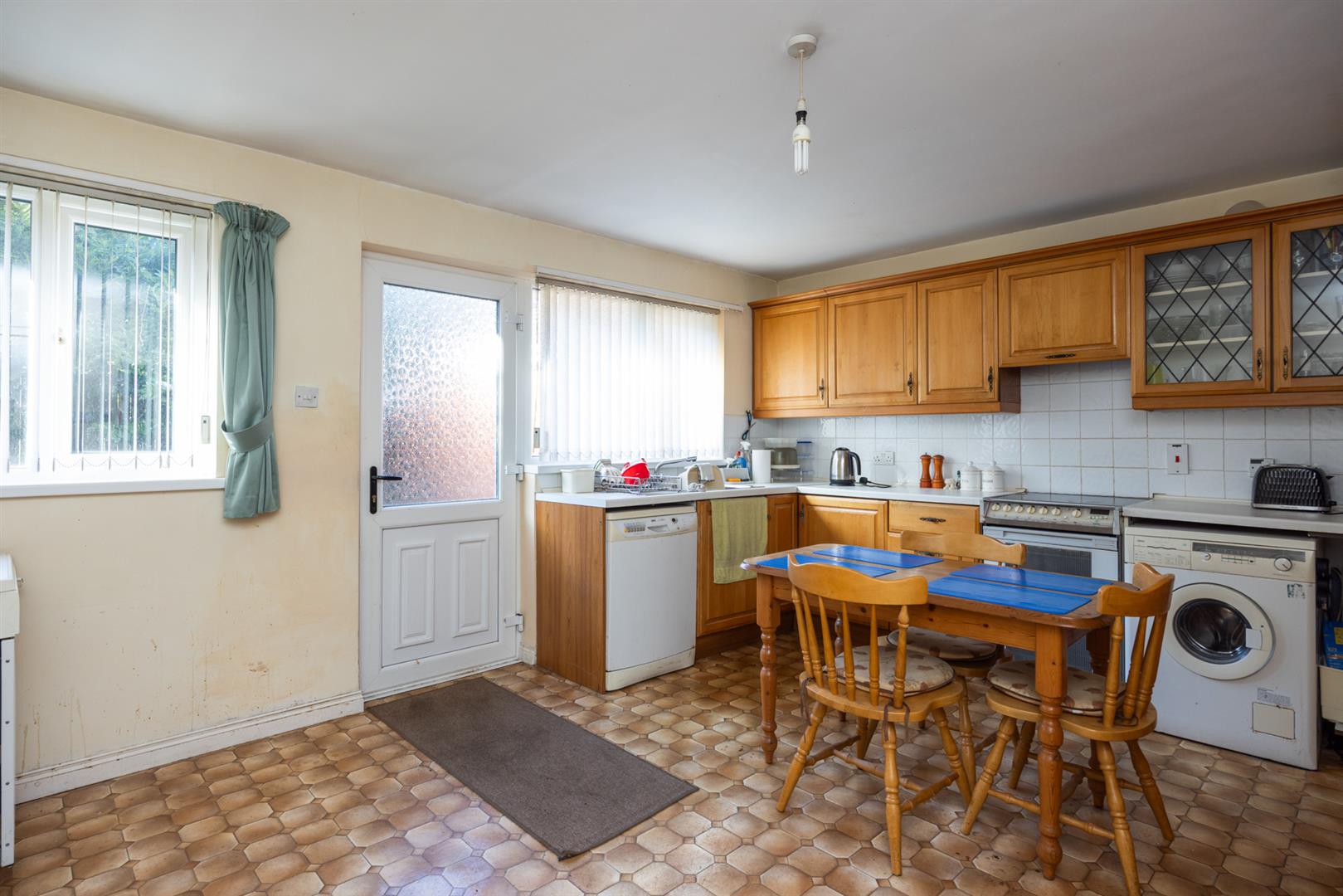 A range of high and low level units including stainless steel sink unit and single drainer, space for washing machine, fridge freezer, dish washer and oven. Tiled splash area. Door to rear.