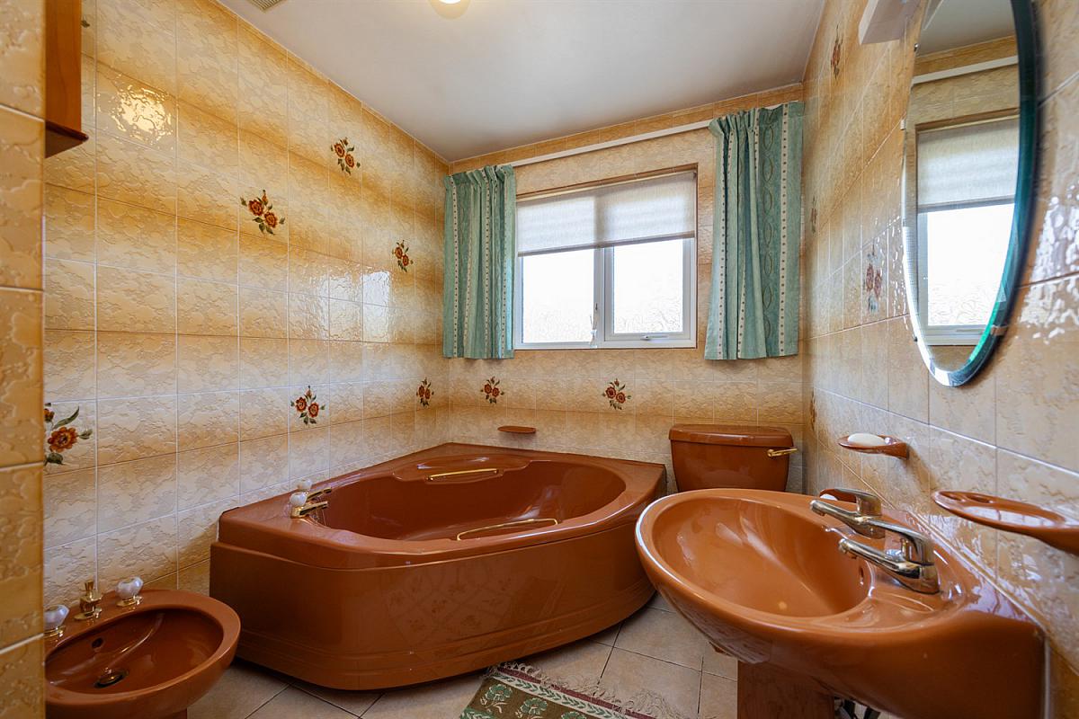 Coloured suite comprising; corner bath, pedestal wash hand basin, bidet, and low flush W.C. Hotpress.