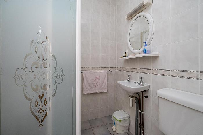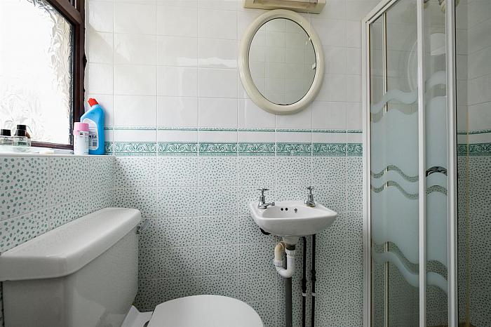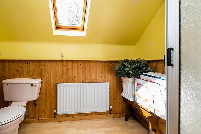 Pink suite; tiled shower cubicle with Redring 7X electric shower; corner opening shower doors and side panels; pedestal wash hand basin; close coupled wc; pine tongue and groove panelling to dado rail; wood laminate floor; Velux ceiling window; extractor fan.