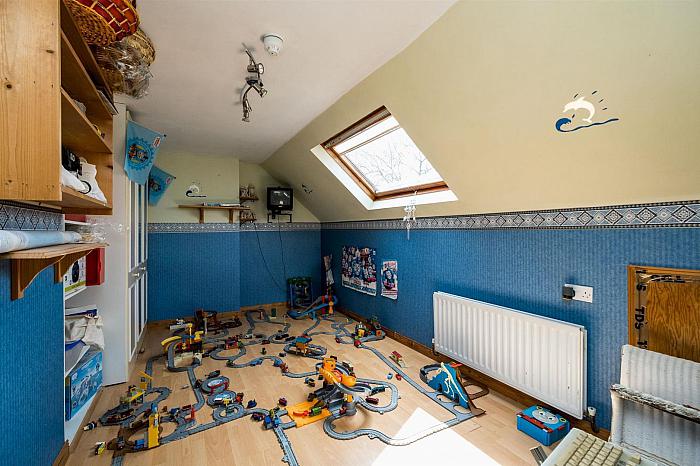 Double built in wardrobe and shelved cupboard; Velux ceiling window; wood laminate floor; tv aerial connection point; built in shelves; access to eaves.