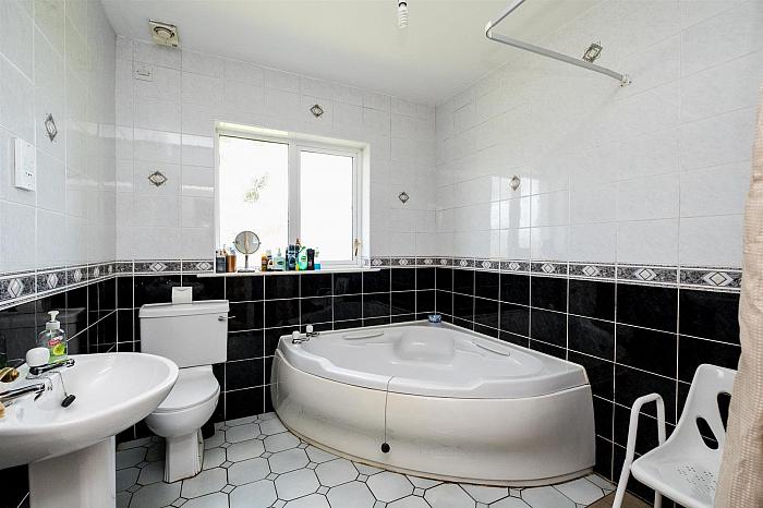 White suite comprising corner bath; pedestal wash hand basin; low flush wc; wet room; shower with thermostatically controlled shower; tiled walls and floor; shaver socket.