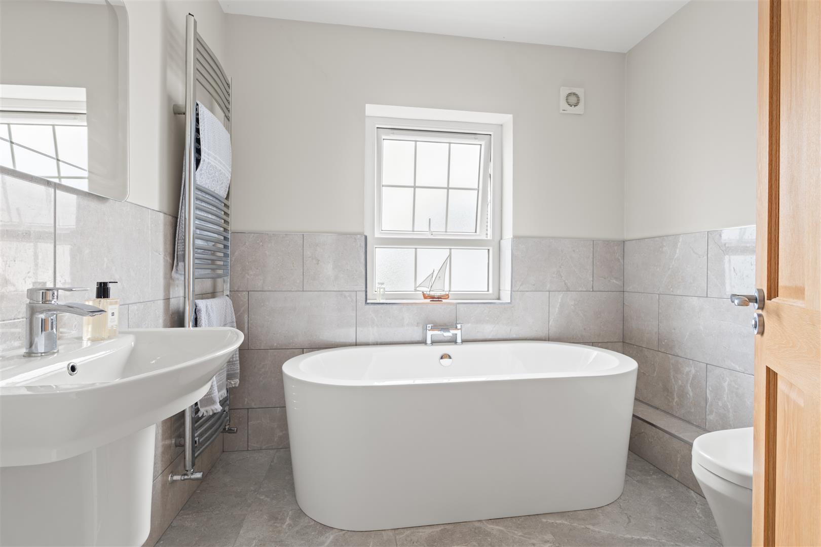 White suite comprising freestanding bath with centrally located mixer tap; rectangle tiled shower cubicle with thermostatically controlled shower and telephone shower attachment; folding glass shower door; close coupled WC; semi pedestal wash hand basin will pillar mono mixer taps, illuminated mirror over; chrome heated towel radiator; ceramic tiled floor; part tiled walls; extractor fan; LED spotlights.