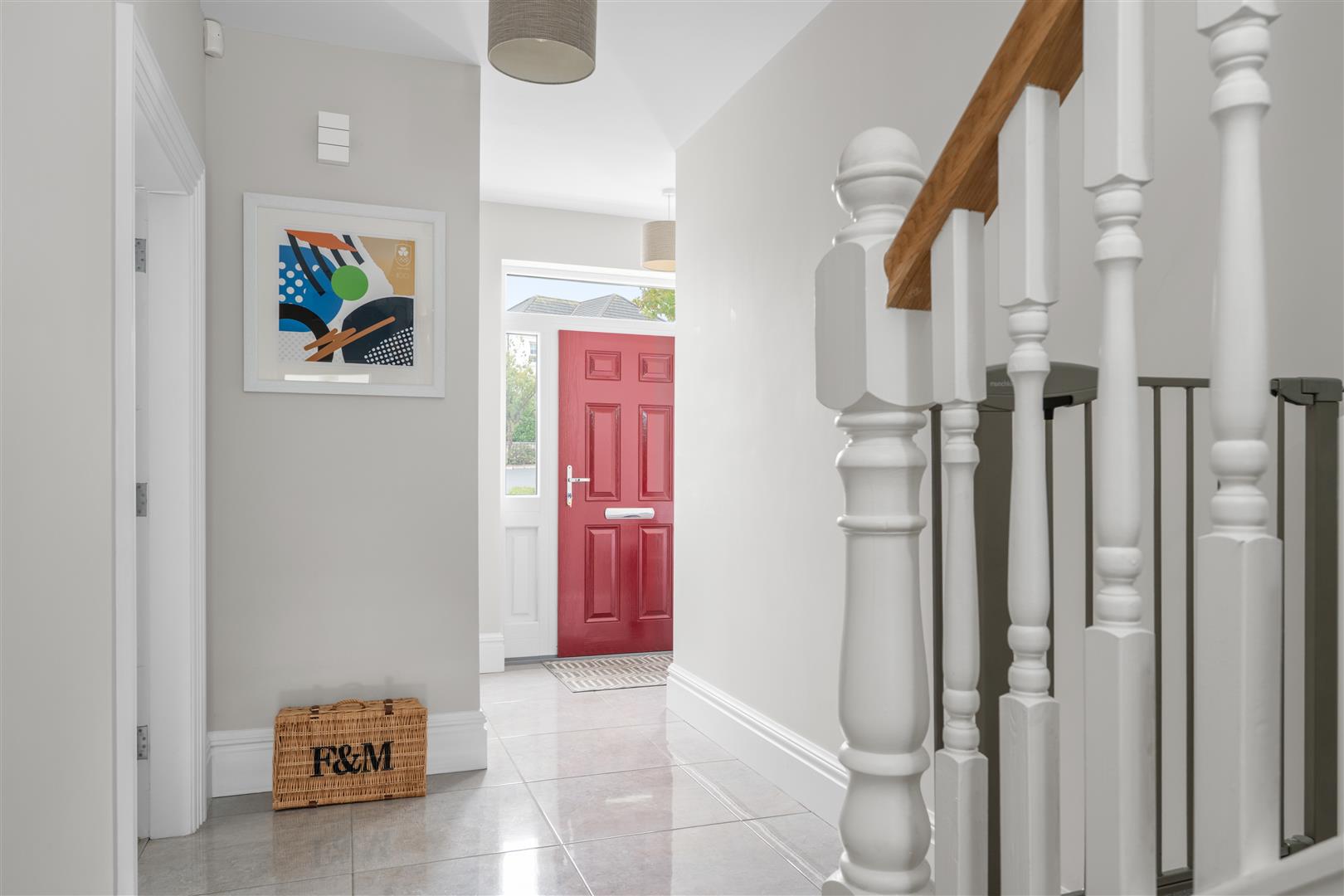 Composite front door with side lights; ceramic tiled floor; under stairs storage cupboard.