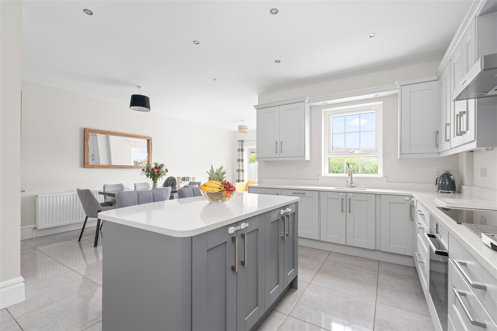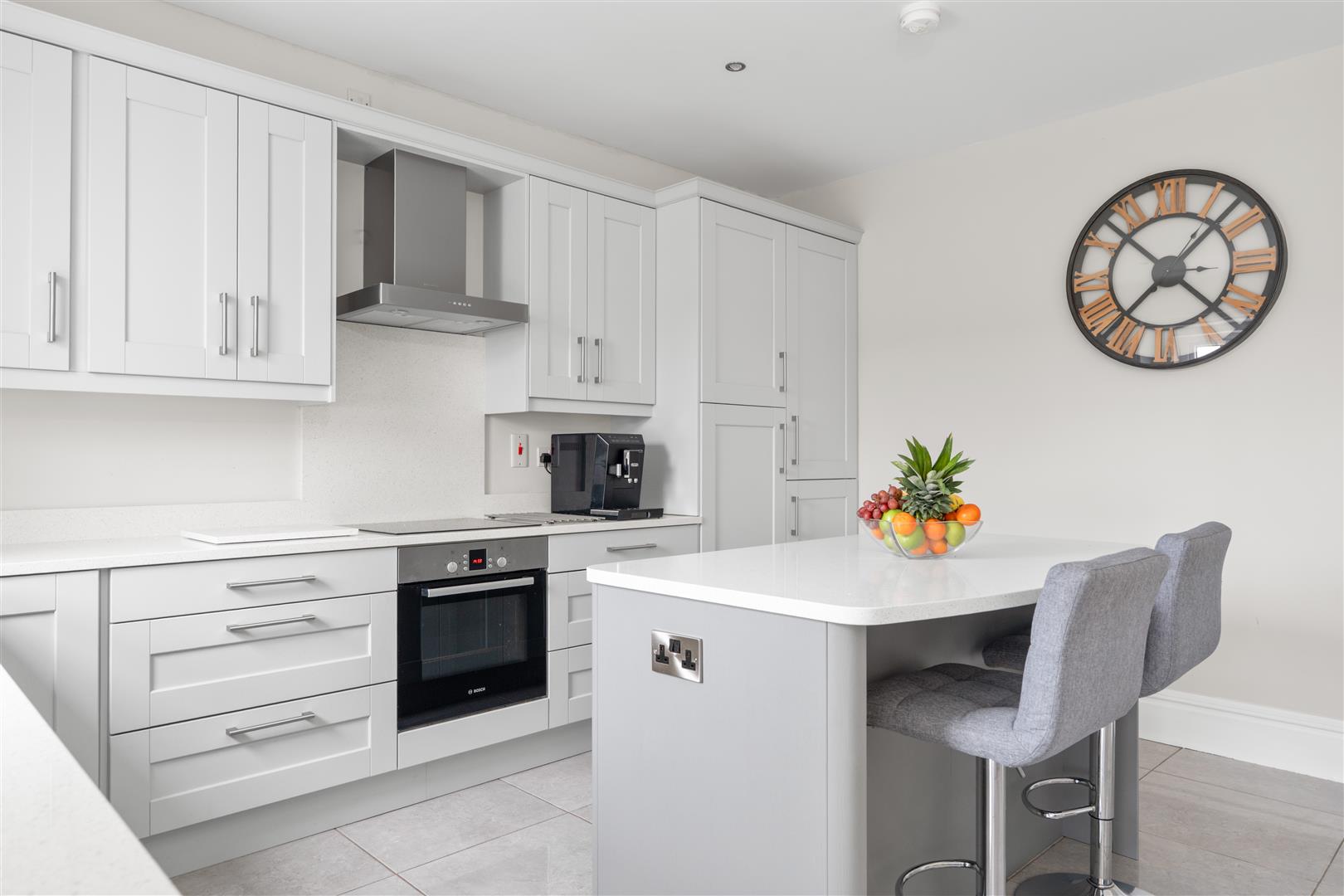 Exstensive range of painted effect high and low level cupboards and drawers; Quartz worktop incorporating single drainer stainless steel sink with chrome swan neck mixer taps; matching island unit with cupboards and breakfast bar; Bosch electric under oven; integrated Beko dishwasher; integrated Hoover fridge / freezer; ceramic tiled floor; sliding patio door to rear gardens.