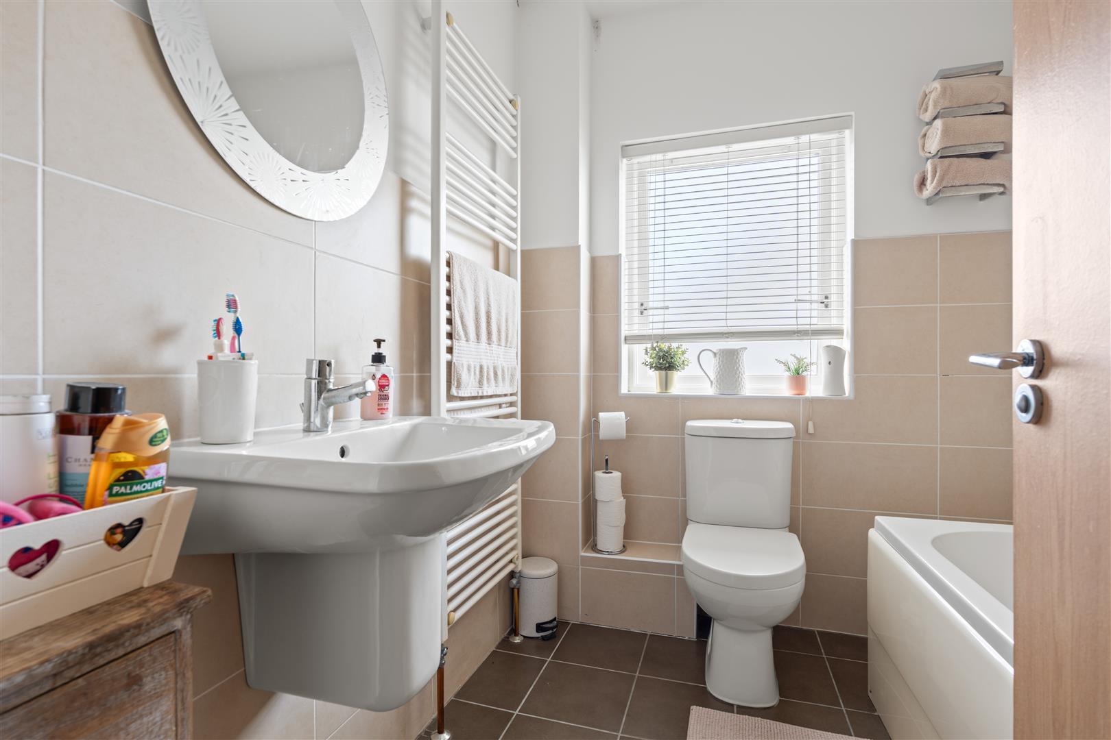 White suite comprising panelled bath with thermostatically controlled shower and telephone shower attachment; glass shower screen; close coupled WC; semi pedestal wash hand basin with mono mixer tap; heated towel radiator; tiled floor and part tiled walls; LED spotlights; extractor fan.