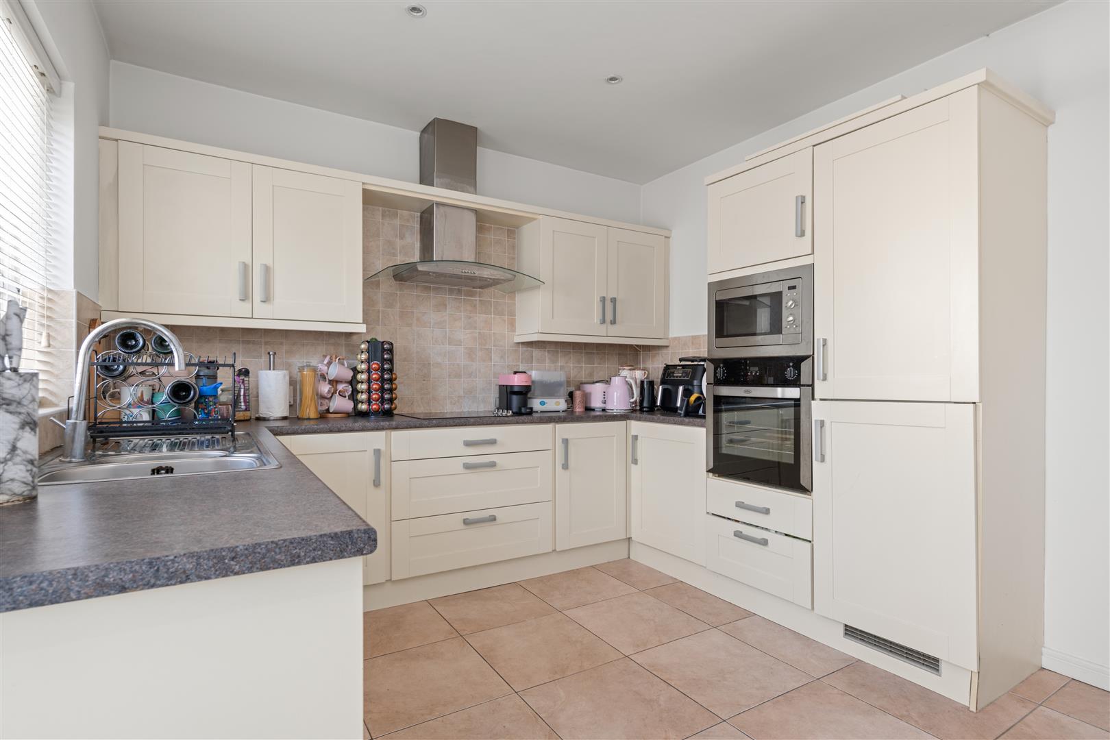 Extensive range of painted effect high and low level cupboards and drawers; formica worktops incorporating 1½ tub stainless steel sink unit with swan neck mixer tap; 4 ring ceramic hob with stainless steel and glass extractor unit and light over; Belling electric oven; integrated microwave; integrated Gorenji fridge / freezer; space and plumbing for washing machine; LED spotlights; double patio doors to rear garden.