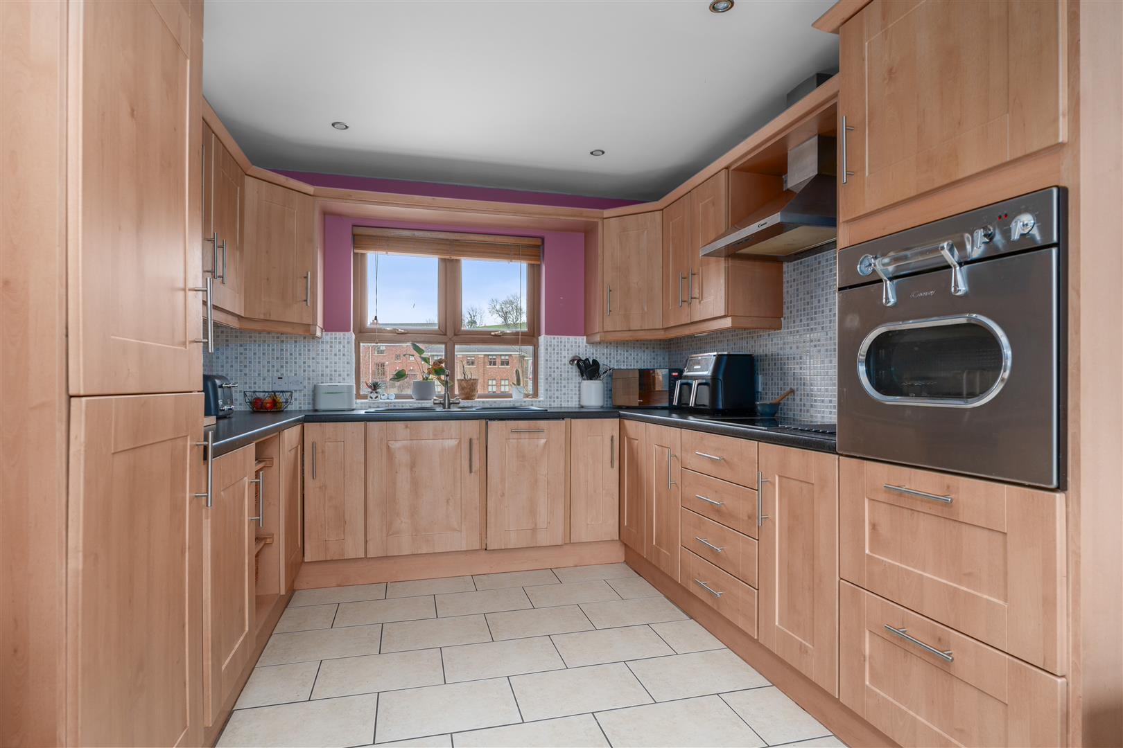 Excellent range of laminate high and low level cupboards and drawers with feature glazed display cupboard and wicker basket storage; formica worktop incorporating Franke 1½ tub single drainer compound sink unit with swan neck mixer taps; integrated Candy fridge / freezer; integrated Hotpoint dishwasher; Candy 4 ring ceramic hob with Candy stainless steel sink unit and light over; Candy brushed stainless steel electric oven; ceramic tiled floor; part tiled walls; 12v spotlights.