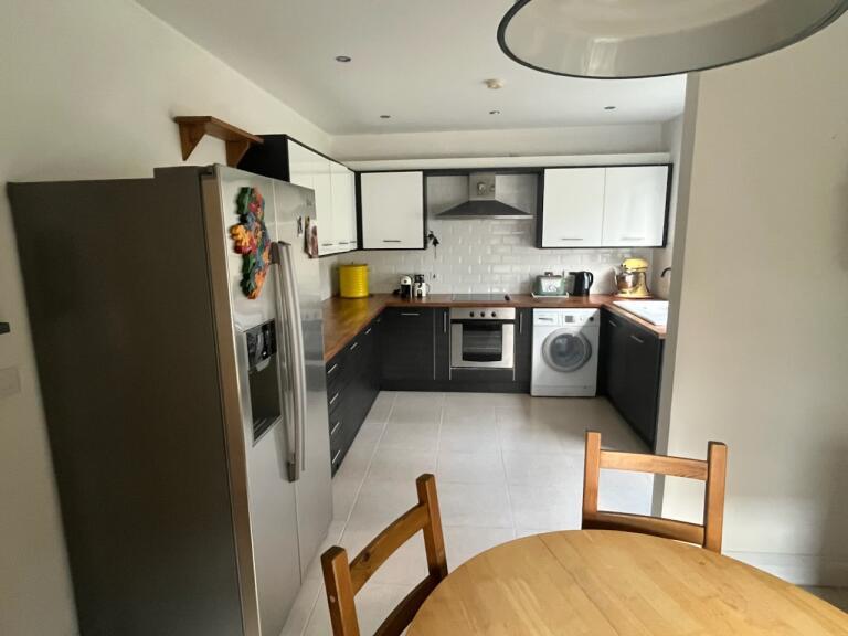 White enamel single drainer 1½ tub sink unit with mixer taps; good range of laminate eye and floor level cupboards and drawers; beech block worktops; integrated Indesit electric under oven and four ring ceramic hob with stainless steel extractor unit over; integrated dishwasher; Bosch washing machine; LG American style fridge; part tiled walls and ceramic tiled floor;