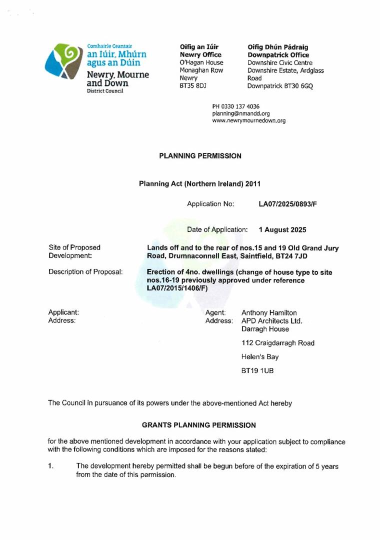 This site forms part of the ever popular and much sought after Grand Jury Lane development and has received full planning permission under application LA07/2025/0893/F dated 19 February 2026, for the development of 4 detached houses. Connections for electric, water, gas and sewers (an article 161 drainage bond is in place) are all available.
