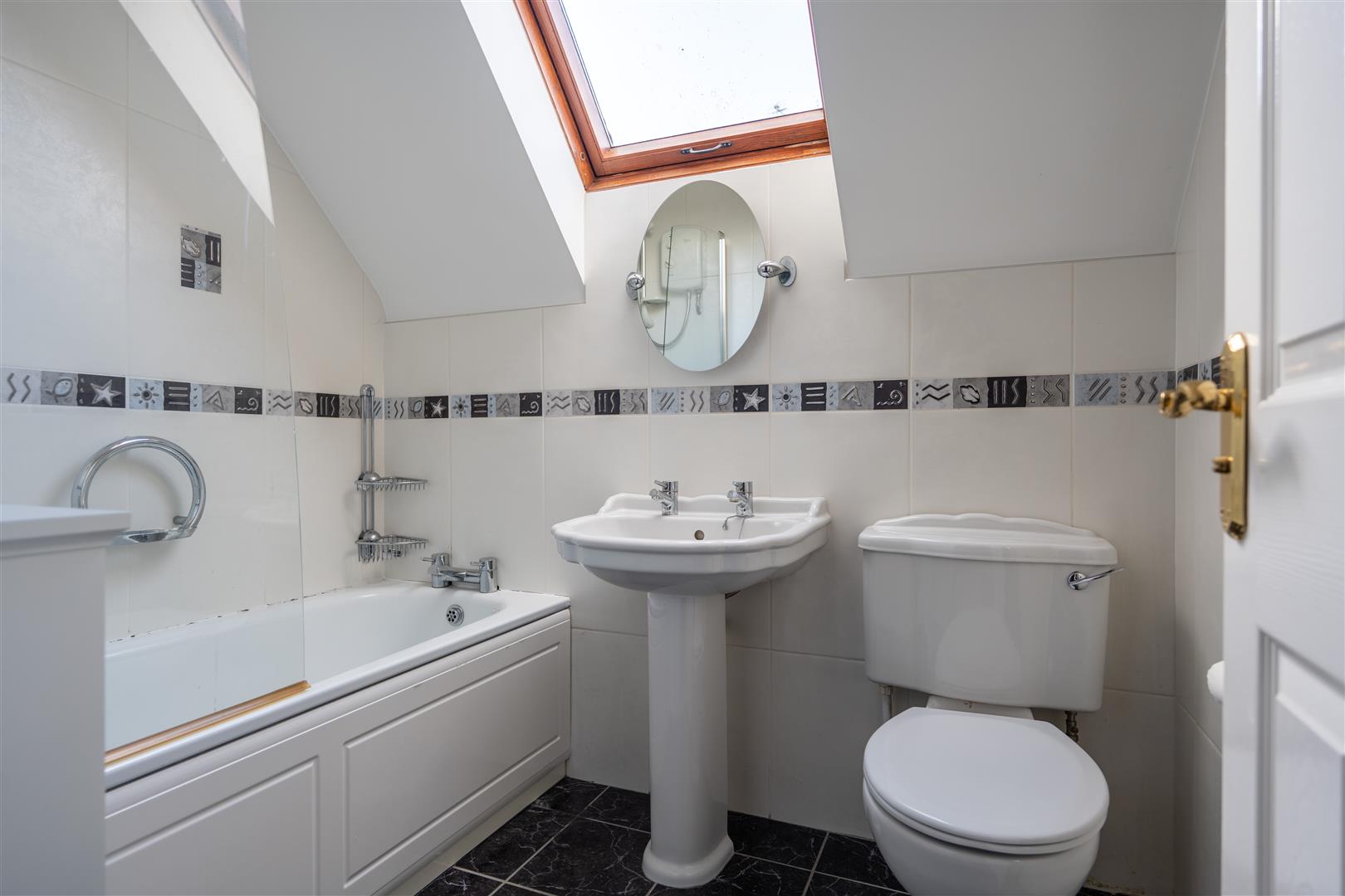 White suite comprising panelled bath with mixer taps; Triton Ivory ii electric shower with wall mounted telephone shower attachment over; glass shower screen; pedestal wash hand basin with chrome taps; low flush WC; chrome heated towel radiator; ceramic tiled walls and floor; Velux ceiling window; extractor fan.