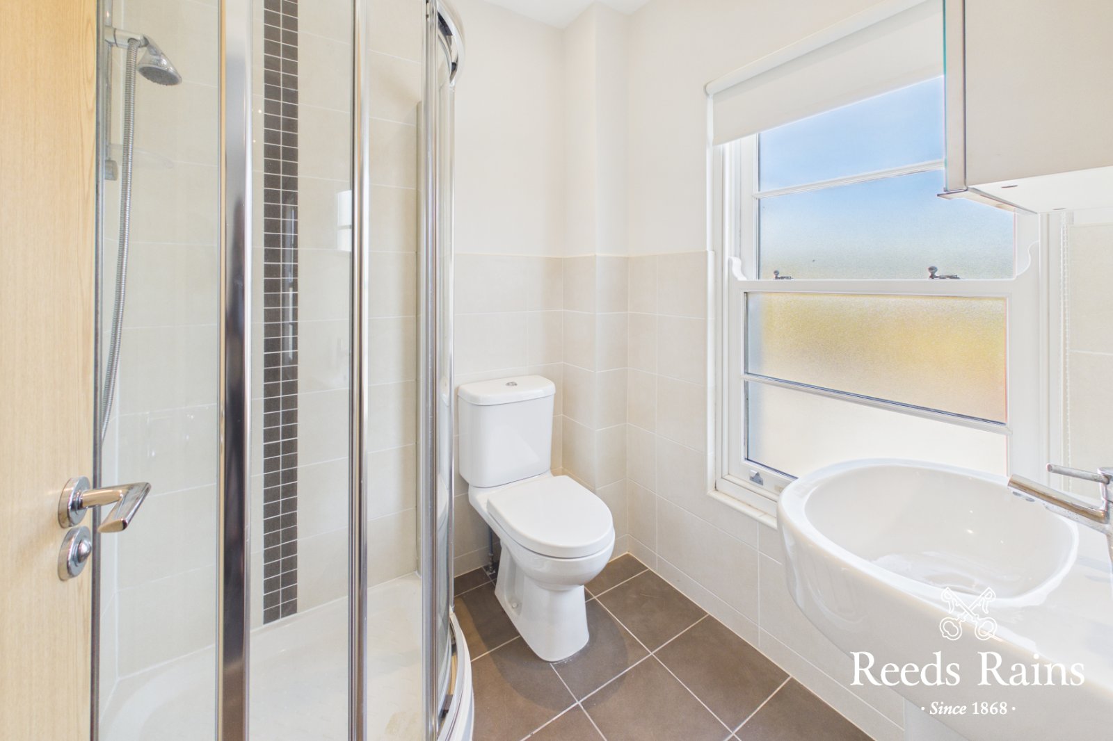 White suite comprising tiled shower cubicle, low flush wc and wash hand basin with mono tap. Part tiled walls. Tiled floor.