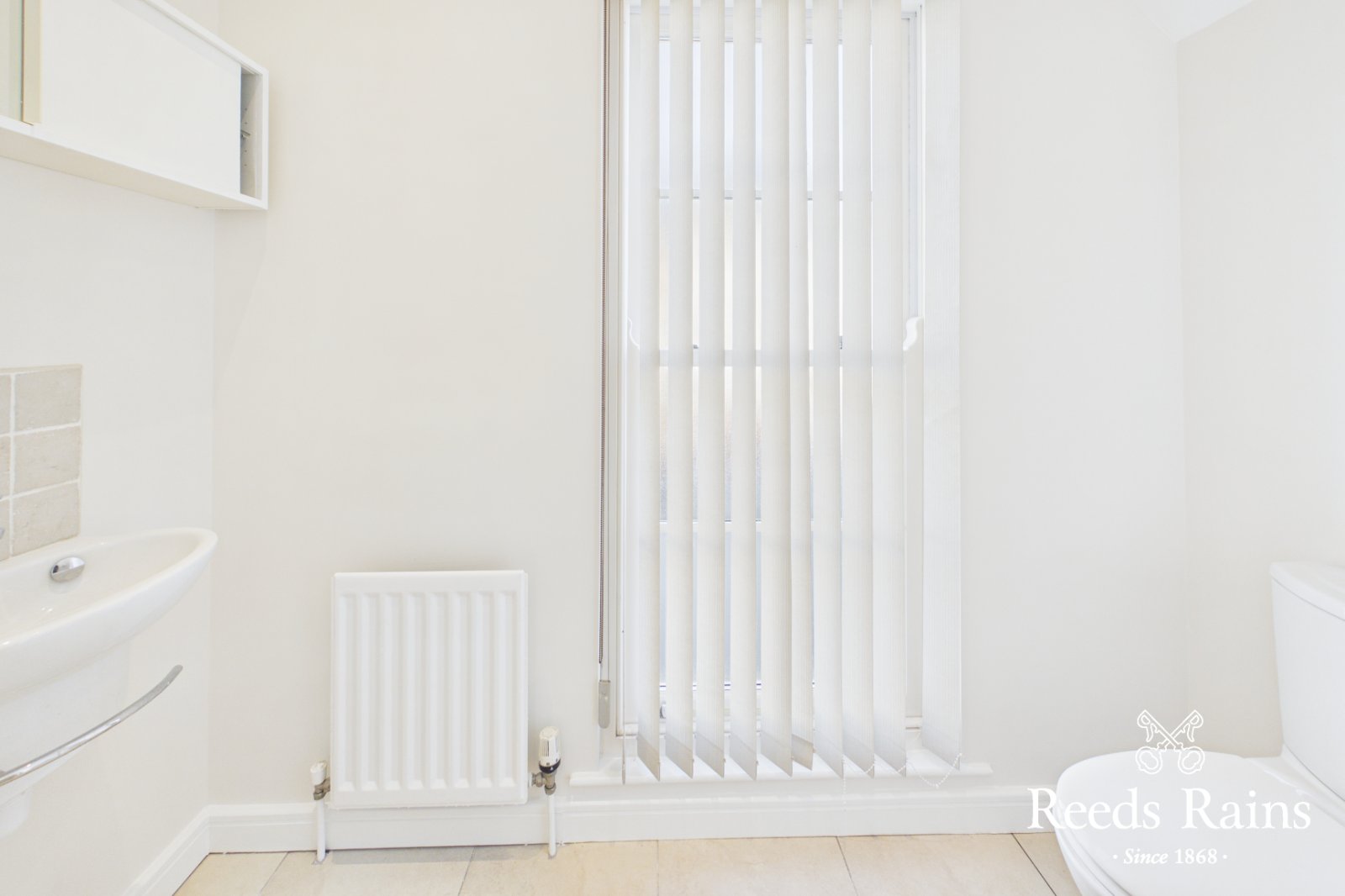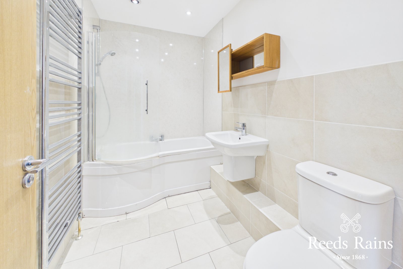 Panel bath with telephone hand shower and shower screen. Wash hand basin with mono tap. Part tiled walls. Wall chrome radiator. Tiled floor. Low flush WC.