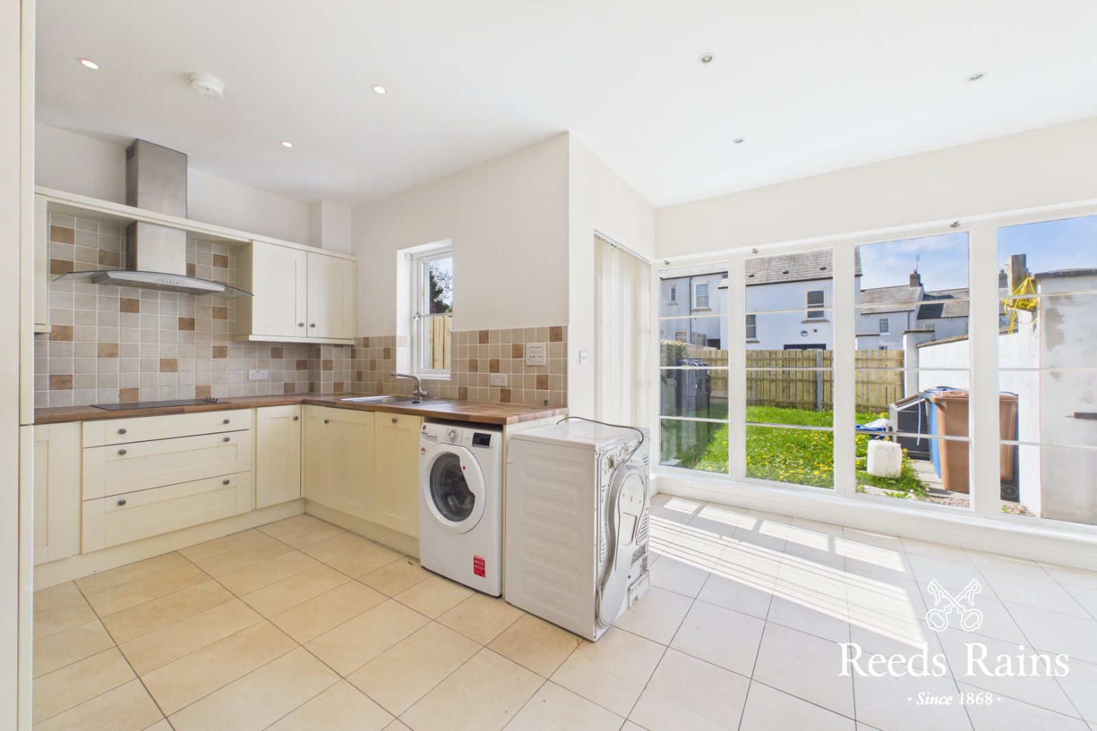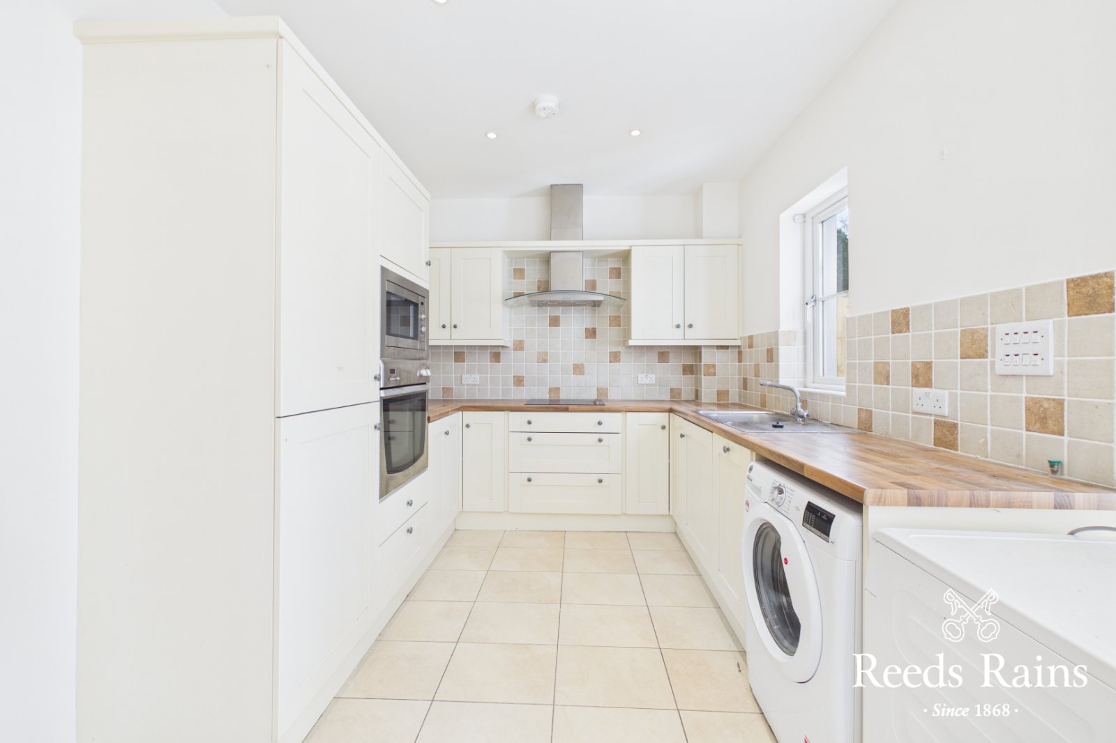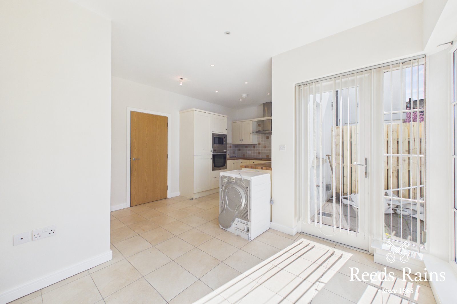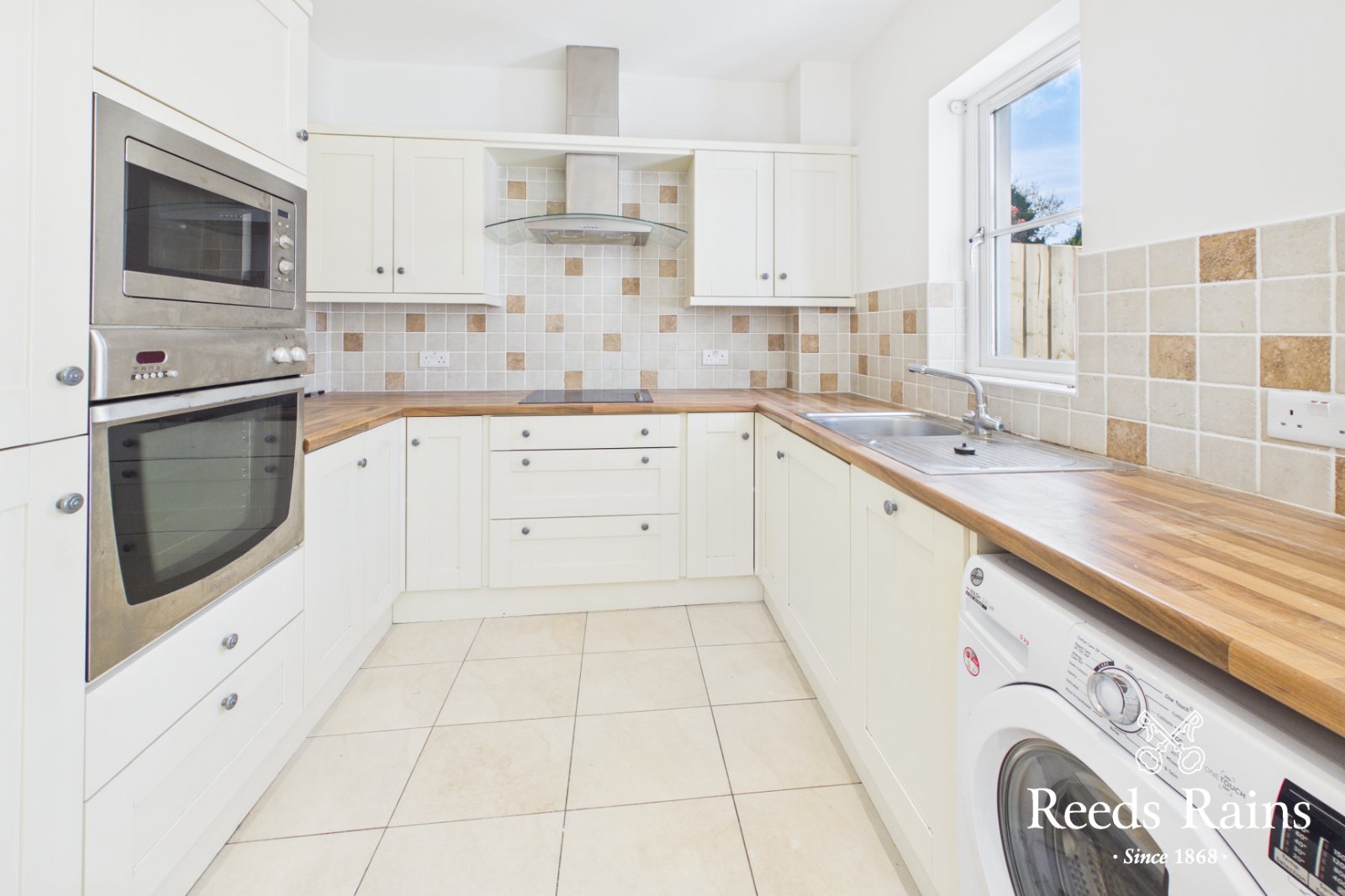 Range of high and low level units, and built in appliances including oven, microwave and ceramic hob. Stainless steel sink unit. Part tiled walls. Tiled Floor. French doors to garden.