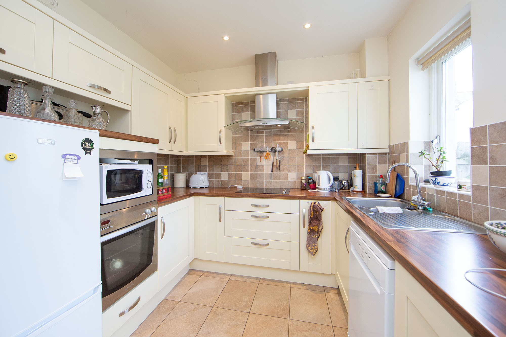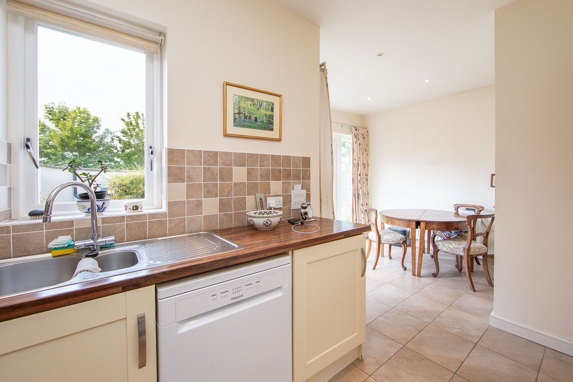 Open to dining area/sun room. Range of high and low built in units with electric hob and oven, stainless steel extractor, integrated washing machine, plumbing for dishwasher, part tiled walls and tiled floor