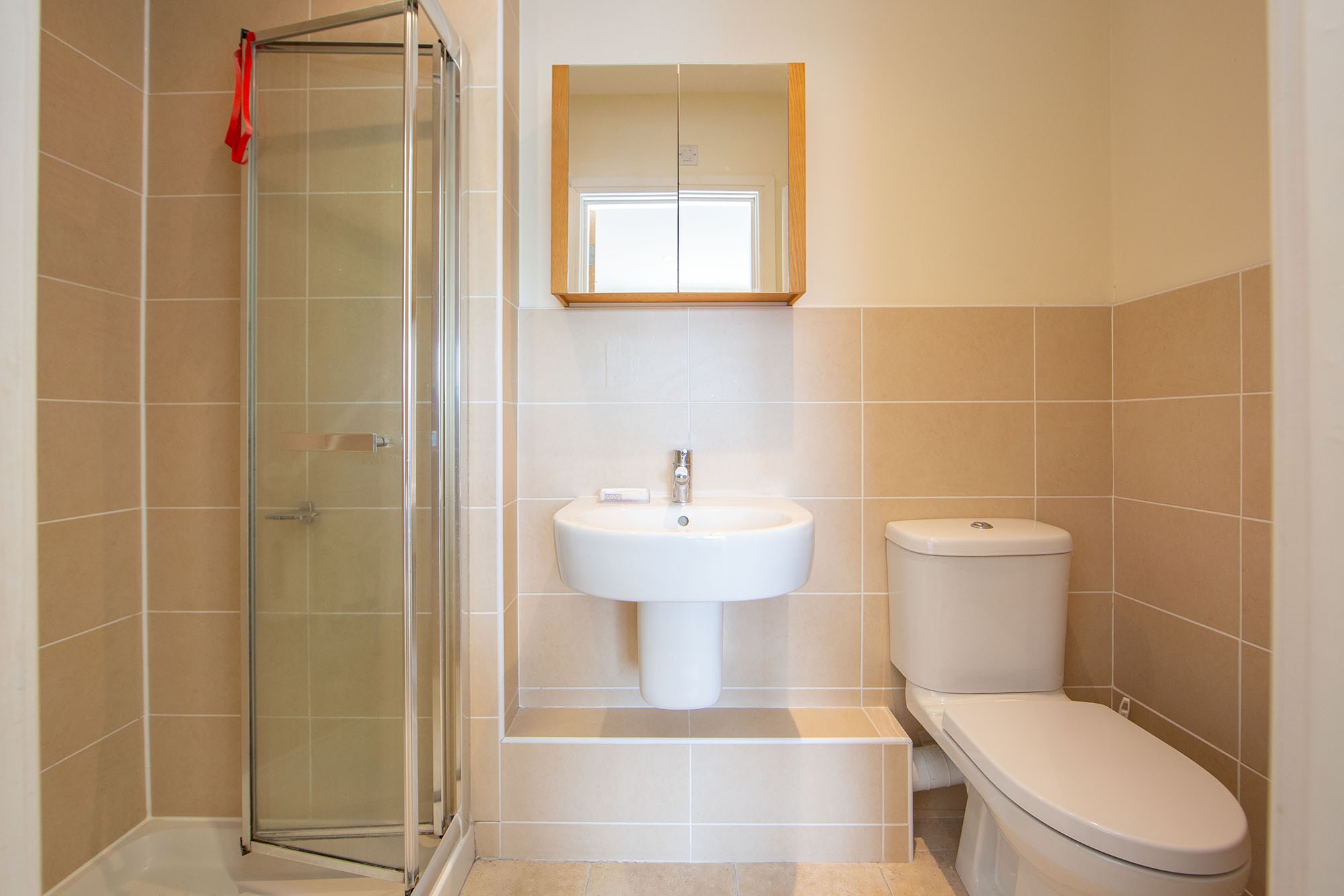 With fully tiled shower cubicle, thermostatic shower, WC and wash hand basin, part tiled walls and towel rail radiator