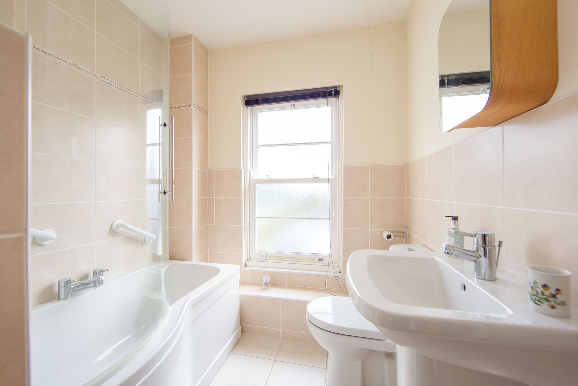 White suite comprising 'P' shaped bath/shower with tiled shower area and screen, WC and wash hand basin. Tiled floor and part tiled walls. Towel rail radiator
