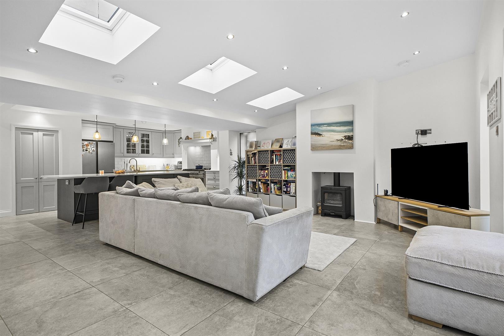 The property is approached via a welcoming entrance hall leading to a comfortable family lounge featuring a multi burning stove which creates a warm and inviting focal point. The heart of the home is the exceptional spacious open plan kitchen / living / dining area. The bespoke fully fitted kitchen provides excellent storage and preparation space, while ample room for dining and a bright family living area make this an ideal setting for everyday living and entertaining. Double doors open directly onto the rear garden, and a further wood burning stove enhances both comfort and character.