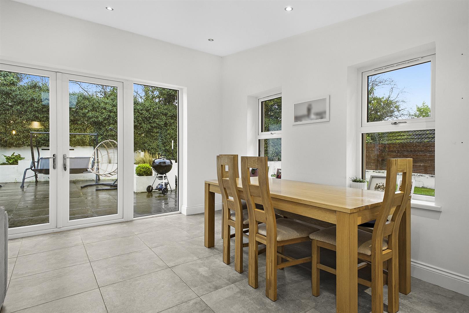 Ample dining space, large living space with feature wood burning stove, frosted feature glass windows, outlook to rear garden, uPVC French doors to rear garden, access to utility room