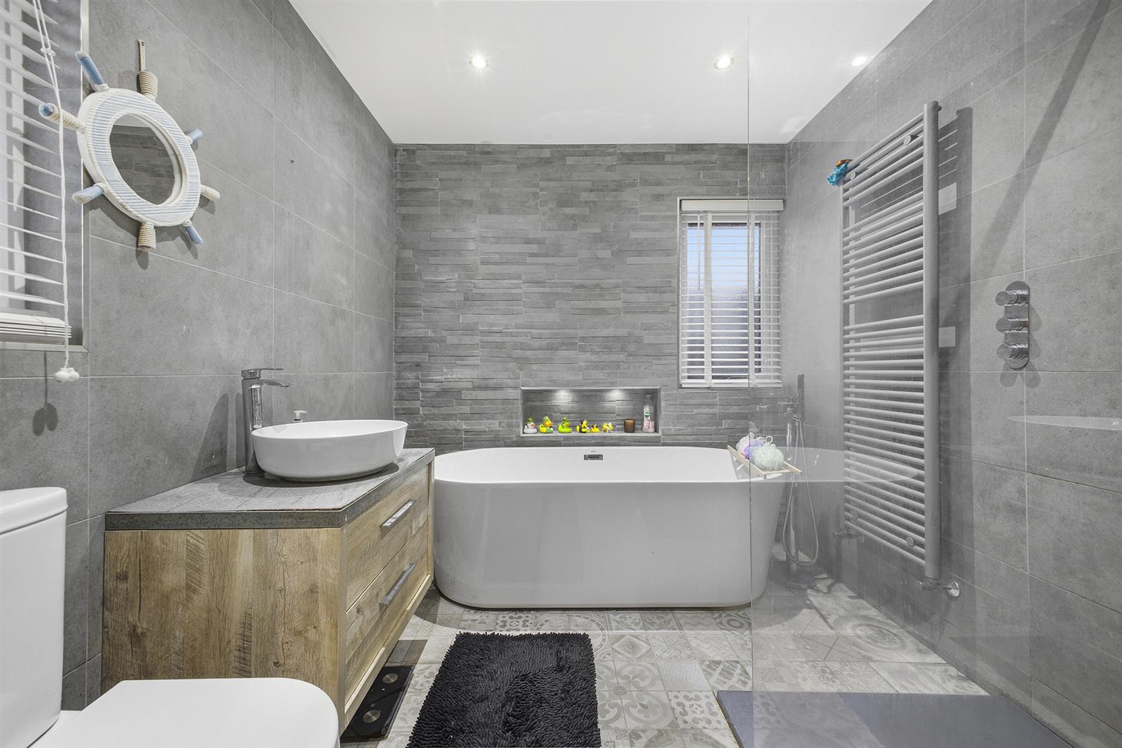 Decorative tiled floor, dual aspect outlook to front and side, recessed spotlights, extractor fan, fully tiled walls with inset shelving, chrome heated towel rail, four piece modern white suite comprising; freestanding bath with floor mounted tap and handheld attachment, vanity unit with drawers, sink and chrome mixer tap, low flush WC, walk in shower with glass shower screen and thermostatically controlled handheld attachment and overhead drencher.