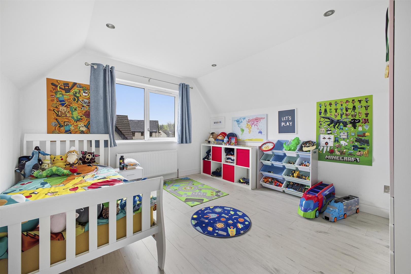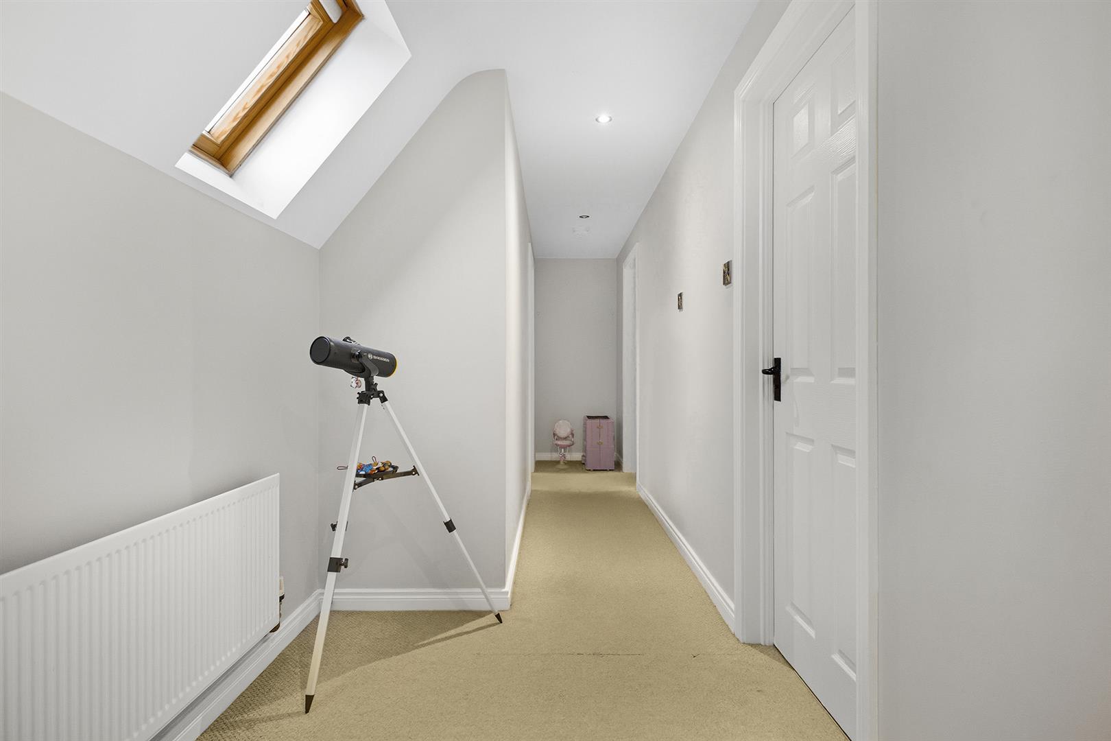 Carpet, large window to rear, Velux window to front, recessed spotlights, access to linen press with excellent storage options.