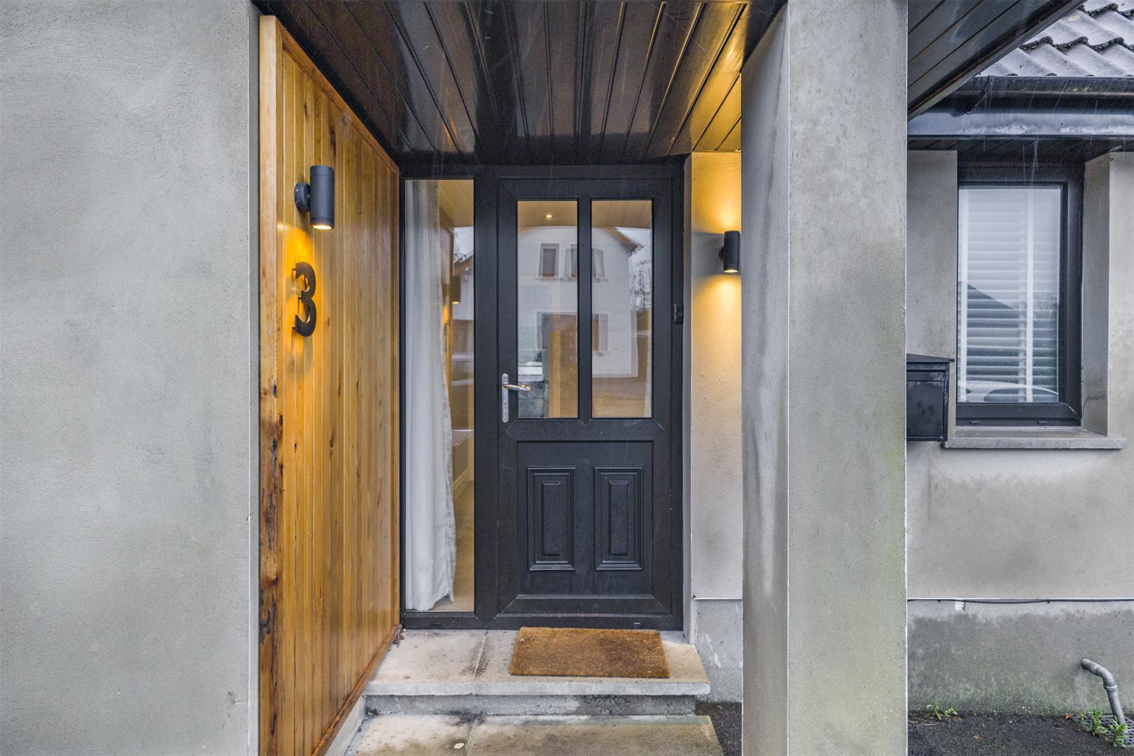 Covered porch / courtesy light / feature wood panel wall with uPVC front door, double glazed glass inset and glass side panels