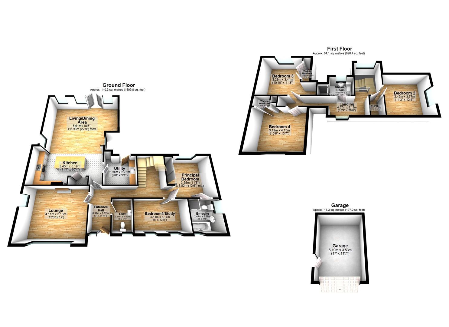 The ground floor is further complemented by a convenient downstair WC, utility room, a principal bedroom with a contemporary four-piece ensuite bathroom, and a fifth bedroom which would also be perfectly suited as a home office or study.