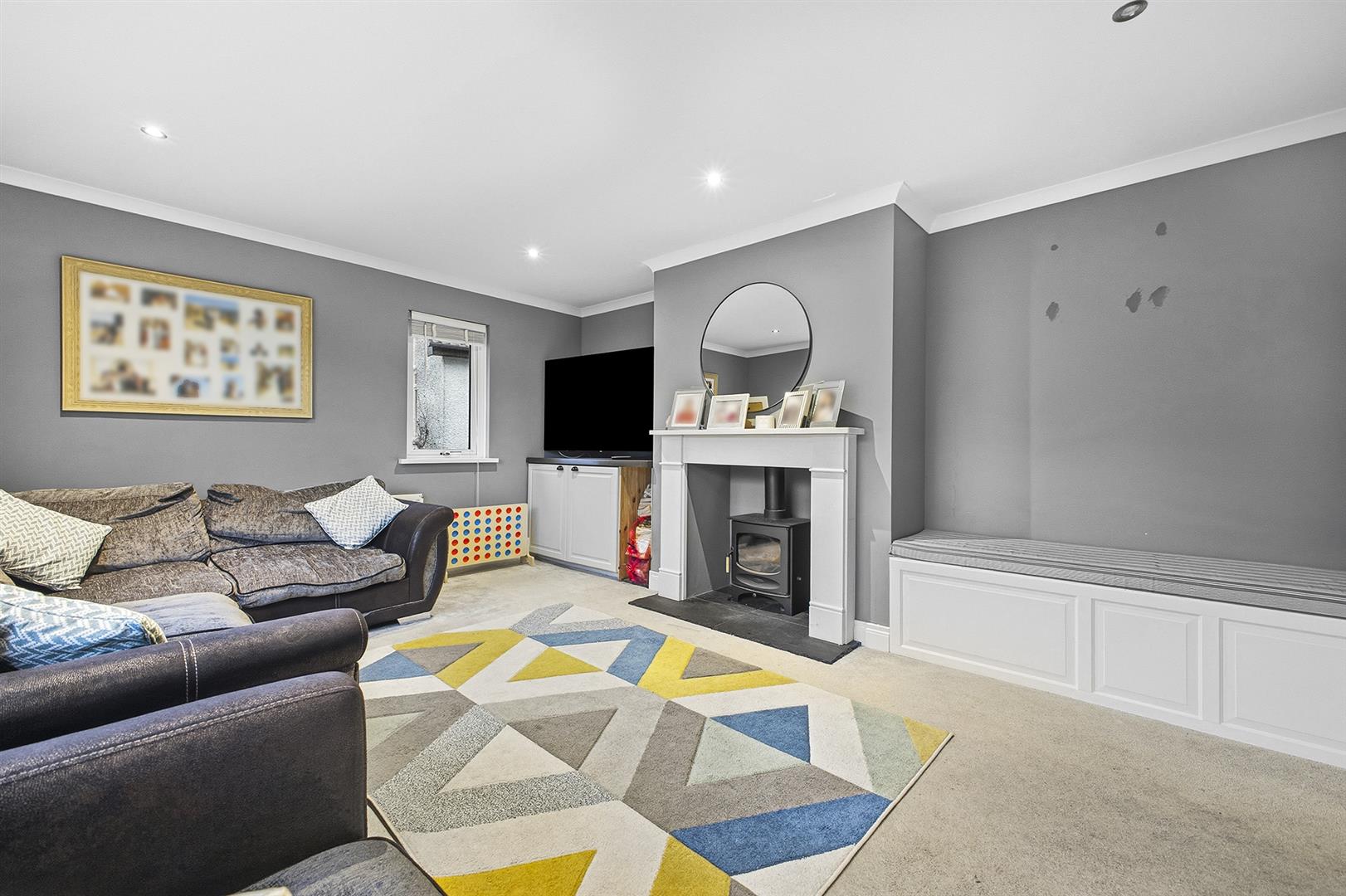 Carpet, outlook to front, cornice ceiling, recessed spotlights, built in seating, feature multi burning stove with Sandstone surround and slate hearth.