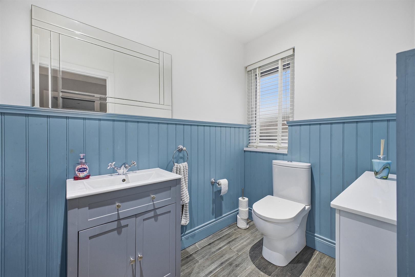 Wood effect tiled floor, outlook to front, recessed spotlights, feature panel walls, two-piece suite comprising; low flush WC and vanity unit with sink and chrome mixer tap.