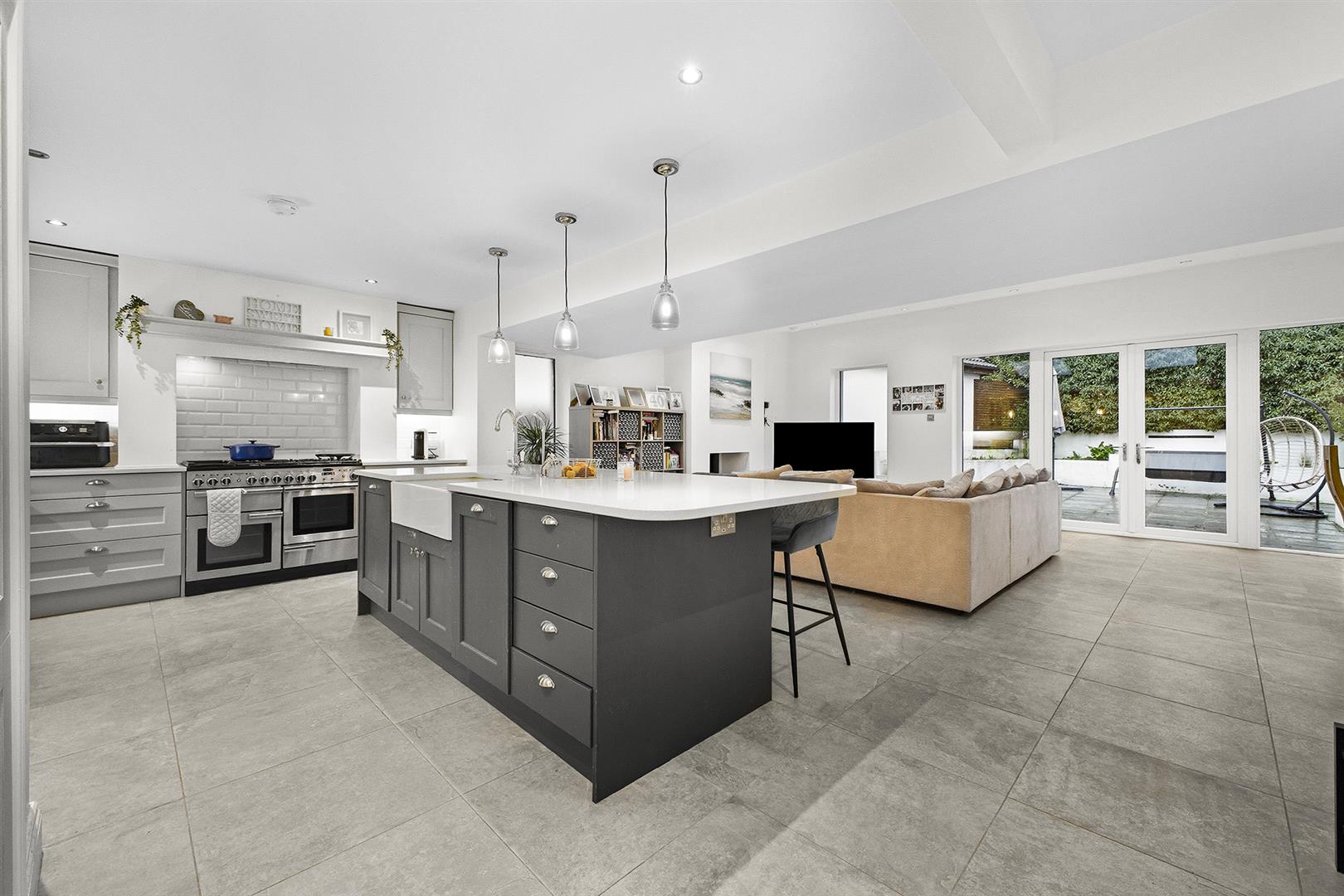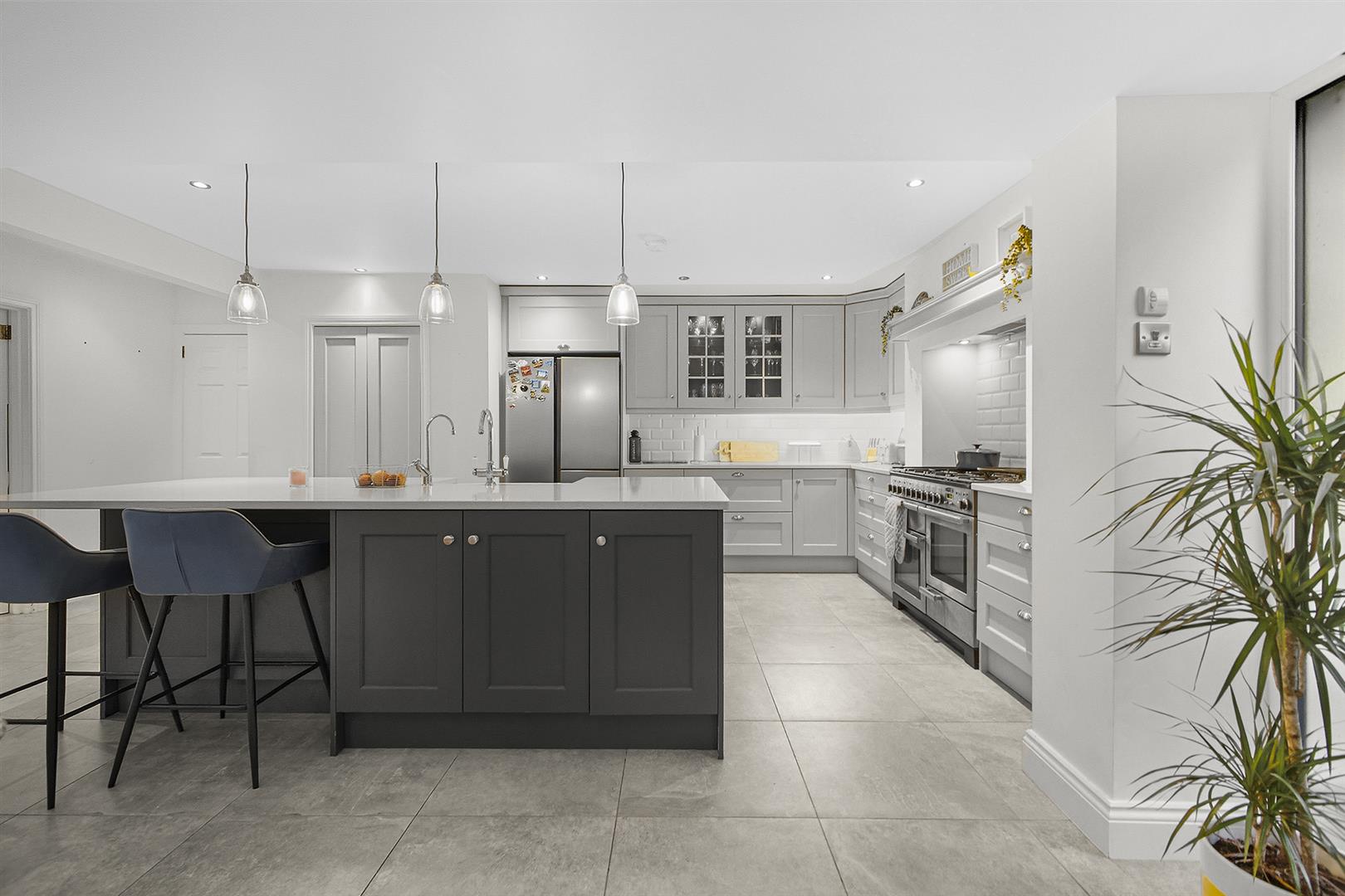 Porcelain tiled floor, recessed spot lights, feature lighting above island, excellent range of bespoke high and low level units with solid wood doors and Quartz worktop, chip shop style tiled splashback, under counter lighting, Island with breakfast bar seating, large walk in pantry, space for American fridge / freezer, deep pan drawers, display cabinets, space for Range cooker, extractor fan, double inset ceramic Rangemaster sink, chrome mixer tap, hot water tap, integrated dishwasher, integrated pull out bins