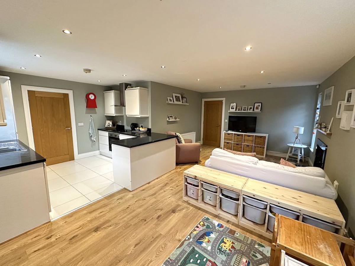 Full range of high and low level fitted modern units with 1 1/2 bowl stainless steel sink unit and mixer tap and worktop lighting, built-in oven and ceramic hob with stainless steel extractor hood and fan, built-in fridge/freezer and fully integrated dishwasher, tiled floor to kitchen area, laminate wooden floor to remaining, feature cast iron stove with tiled inset and granite hearth/surround, TV point, recessed ceiling spots, PVC double glazed double doors to patio, 4 double radiators.