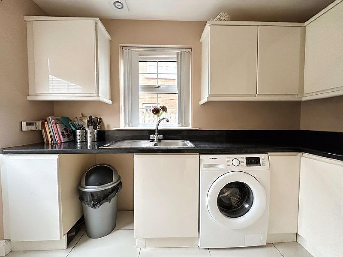 Matching range of high and low level fitted units with single drainer stainless steel sink unit and mixer tap, plumbed for automatic washing machine and space for tumble dryer, tiled floor, PVC double glazed back door, double radiator.