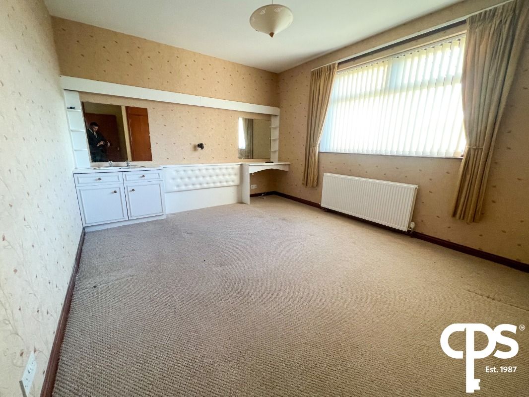 This main bedroom is a large double bedroom with built in side boards and sink. Bright room with scenic views. Built in wardrobe and carpeted floor. Tv points for wall mounted TV. Electrical points and double radiator.
